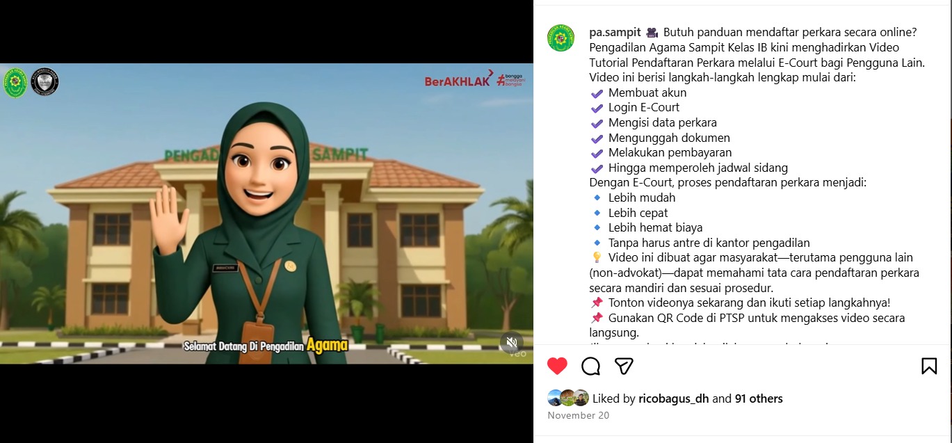 Hadirnya video tutorial pendaftaran e-Court bagi pengguna lain yang diprakasai oleh Bunga Setyamika, S.H., CPNS Pengadilan Agama Sampit, menjadi sarana sosialisasi dan edukasi dalam mempermudah pihak berperkara memahami proses pendaftaran dan pengajuan perkara secara elektronik bagi Pengguna Lain. Video tersebut merupakan hasil rancangan aktualisasi Latsar CPNS yang berfokus pada optimalisasi layanan peradilan berbasis digital. Dalam video tutorial tersebut, menjelaskan serta menggambarkan secara runtut dan sederhana tahapan penggunaan e-Court, mulai dari pembuatan akun, pengunggahan dokumen pendukung, proses pendaftaran perkara, hingga tahapan pembayaran biaya perkara secara elektronik. Penyajian informasi yang praktis dan mudah dipahami membuat video ini cepat mendapat respon dari masyarakat diberbagai layanan media sosial Pengadilan Agama Sampit.