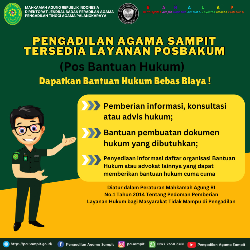 Pada Tahun Anggaran 2026, kembali satker Pengadilan Agama Sampit menerima pagu anggaran untuk Pos Bantuan Hukum (Posbakum) dari DIPA Direktorat Jenderal Badan Peradilan Agama (04) sebesar Rp. 89.976.600,- (delapan puluh sembilan juta sembilan ratus tujuh puluh enam ribu enam ratus rupiah). Pengadilan Agama Sampit bekerja sama dengan LBH Mitra Hukum Bersatu Sampit untuk melaksanakan jasa konsultansi layanan Posbakum ini.