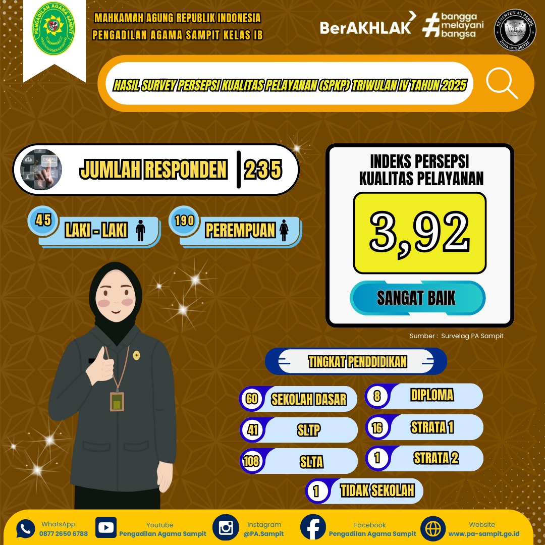 Sampit – Pengadilan Agama Sampit terus menunjukkan komitmennya dalam memberikan layanan publik yang berkualitas. Hal ini tercermin dari hasil Survei Persepsi Kualitas Pelayanan (SPKP) Triwulan IV (Oktober s/d Desember) Tahun 2025, di mana PA Sampit meraih nilai sebesar 3,92 dengan nilai konversi 98 %, yang termasuk dalam kategori “Sangat Baik.” Survei ini diikuti oleh 235 responden yang merupakan pengguna layanan Pengadilan Agama Sampit.