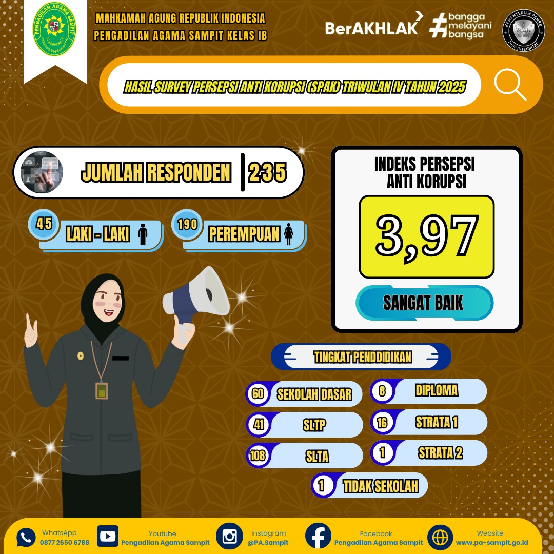 Sampit, Pengadilan Agama Sampit Kelas IB kembali menunjukkan komitmennya dalam menciptakan layanan peradilan yang bersih dan berintegritas. Hal ini dibuktikan dengan capaian nilai Survei Persepsi Anti Korupsi (SPAK) sebesar 3,97 dengan nilai konversi 99, 25 % pada Triwulan IV (Oktober sampai dengan Desember) Tahun 2025, yang menempatkan PA Sampit dalam kategori “Sangat Baik” dengan jumlah responden 235 pengguna layanan.
