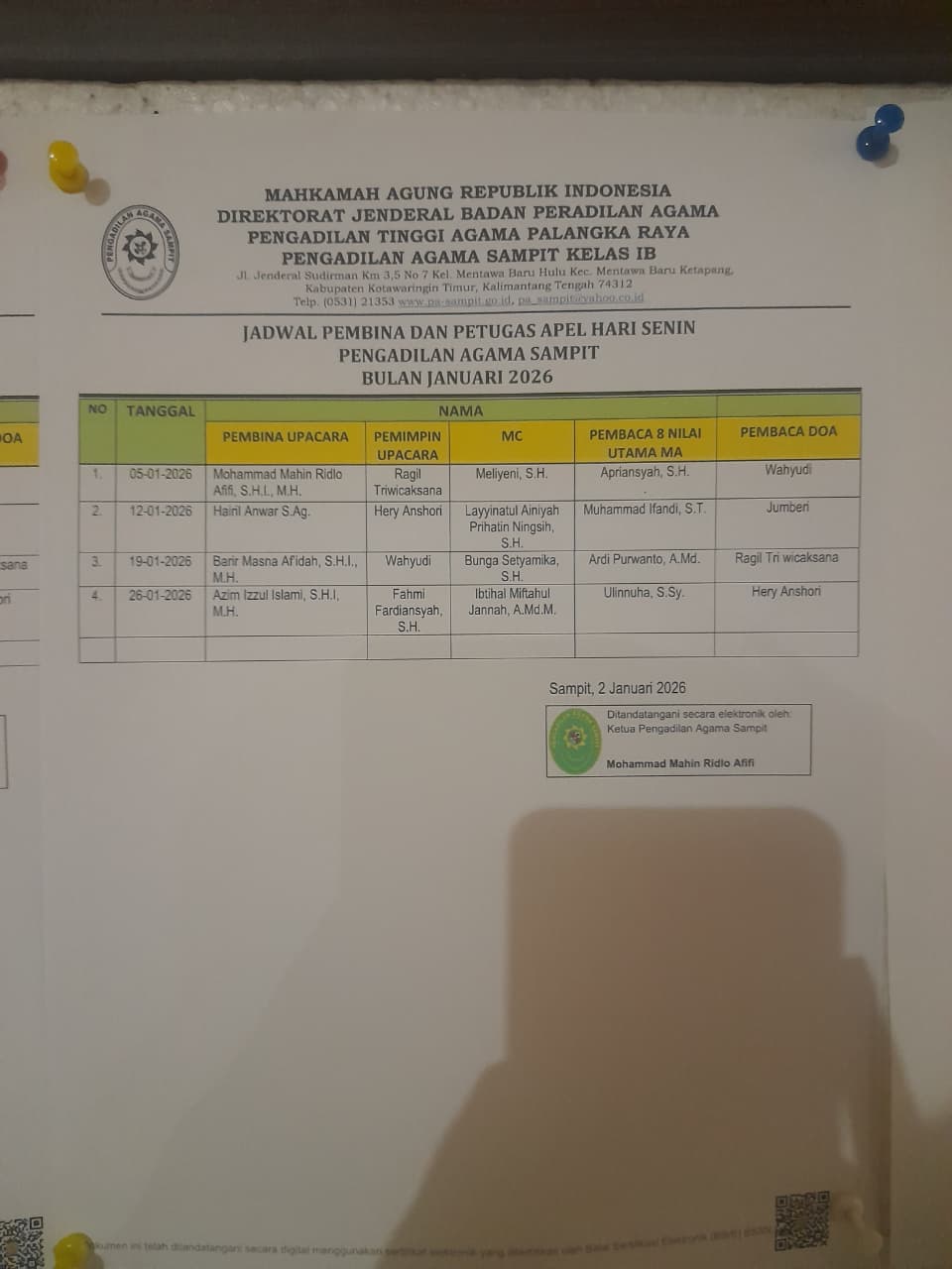 PA Sampit Cetak dan Tempel Jadwal Apel Januari 2026 di Papan Pengumuman
