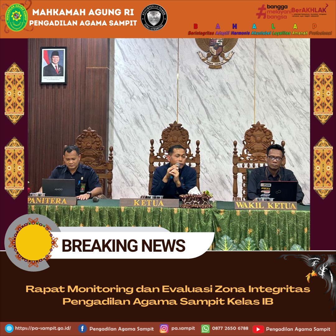Wakil Ketua PA Sampit sekaligus Ketua Pembangunan Zona Integritas Bapak Hairil Anwar S.Ag pimpin Rapat Monitoring dan Evaluasi Zona Integritas Bulan September Pengadilan Agama Sampit Kelas IB didampingi Ketua dan Panitera (10/9/2025). Kegiatan ini berdasarkan surat nomor 46/KPA.W16-A3/UND.HM3.1.3/IX/2025 tentang Undangan Rapat Monitoring dan Evaluasi Zona Integritas dimulai dari jam 14.30 s.d selesai WIB yang diikuti oleh Hakim dan Aparatur.