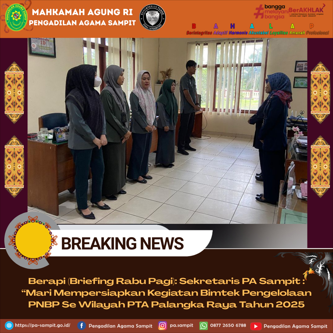 Rabu, 24 September 2025 pukul 08.20 WIB dilaksanakan kegiatan Berapi (Briefing Rabu Pagi) bagian Kesekretariatan Pengadilan Agama Sampit, sebagai Pengarah Briefing kali ini yaitu Sekretaris Isnaniyah, S.Ag., diikuti oleh Kasubbag, Staf Pelaksana, PPPK, Honorer dan siswa PKL SMK Muhammadiyah Sampit.