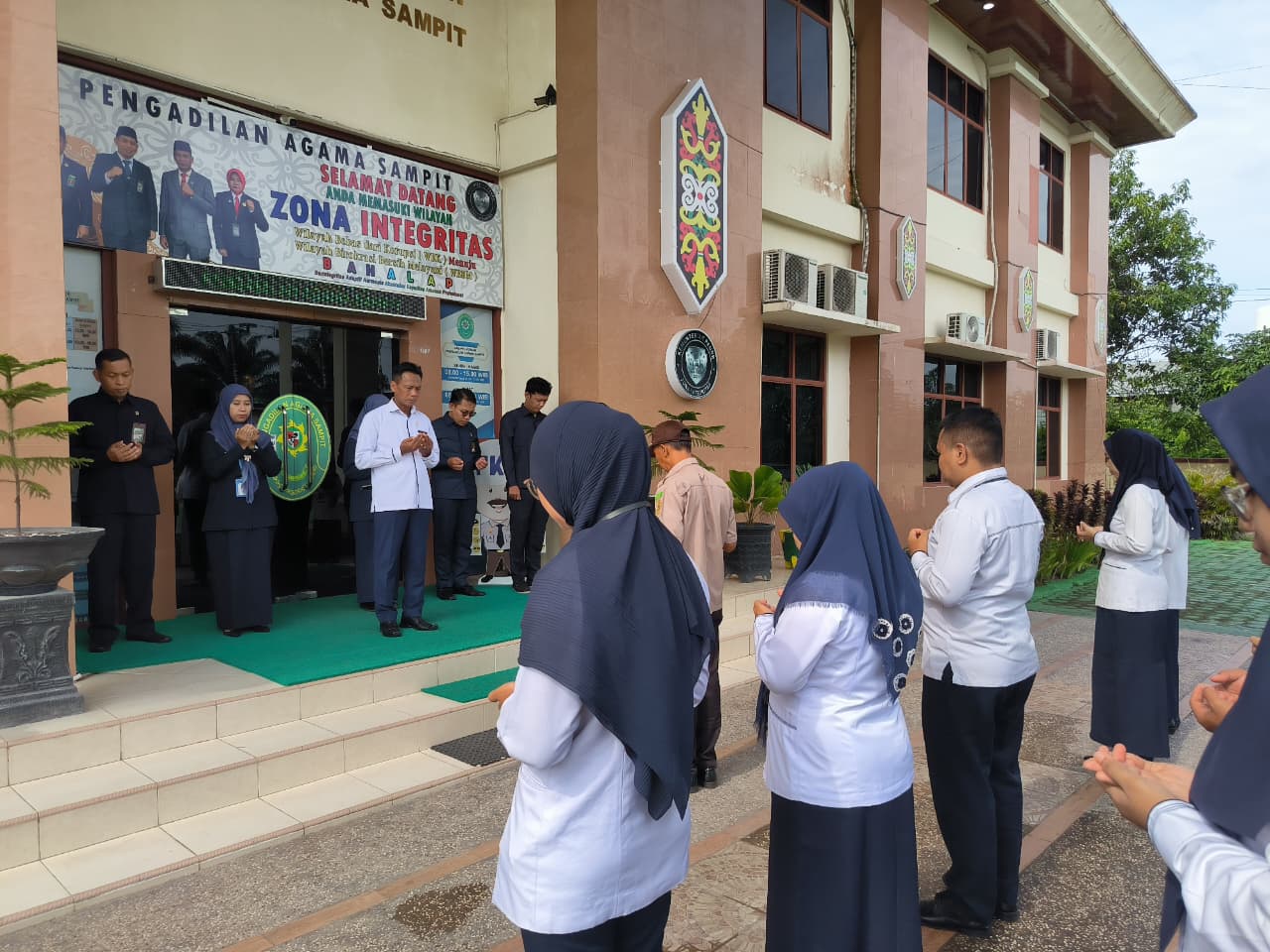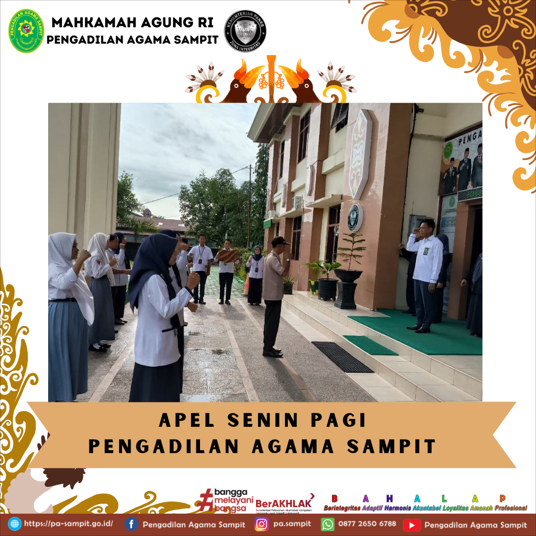 Sampit, 29 September 2025, Pembuka rangkaian kegiatan dipekan ini diawali apel senin pagi. Apel dilaksanakan bertempat di Halaman Depan PA Sampit yang diikuti oleh seluruh Hakim dan Aparatur Serta Siswa PKL SMK Muhammadiyah. Dalam apel kali ini security Jumberi bertugas sebagai komandan apel dan Hakim Pengadilan Agama Sampit Kelas IB Hairil Anwar S.Ag., bertindak sebagai pembina apel. Disisi lain petugas yang kali ini bertugas dengan Linda Arianti, S.Pi sebagai MC, Pembaca 8 Nilai Utama MA Apriansyah, S.H., dan Ardi Purwanto, A.Md bertugas sebagai pembaca doa.