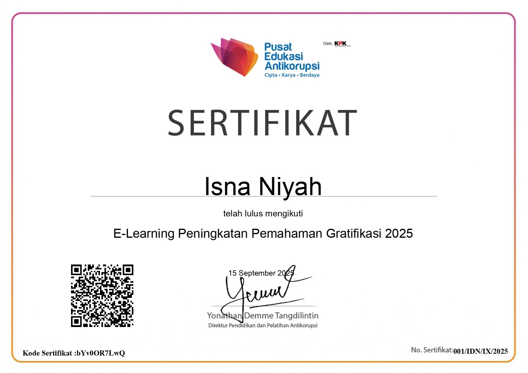 Senin, 15 September 2025, untuk memenuhi Surat Kepala Badan Pengawasan Mahkamah Agung RI Nomor: 3233/BP/DL.1/VIII/2025 tanggal tanggal 5 Agustus 2025 Hal Pendaftaran Kelas E-Learning Peningkatan Pemahaman Gratifikasi, maka Sekretaris Pengadilan Agama Sampit Isnaniyah, S.Ag. mengikuti Kelas E-Learning Peningkatan Pemahaman Gratifikasi yang diselenggarakan oleh Badan Pengawasan Mahkamah Agung Republik Indonesia (Bawas MA RI) yang bekerja sama dengan Komisi Pemberantasan Korupsi (KPK).