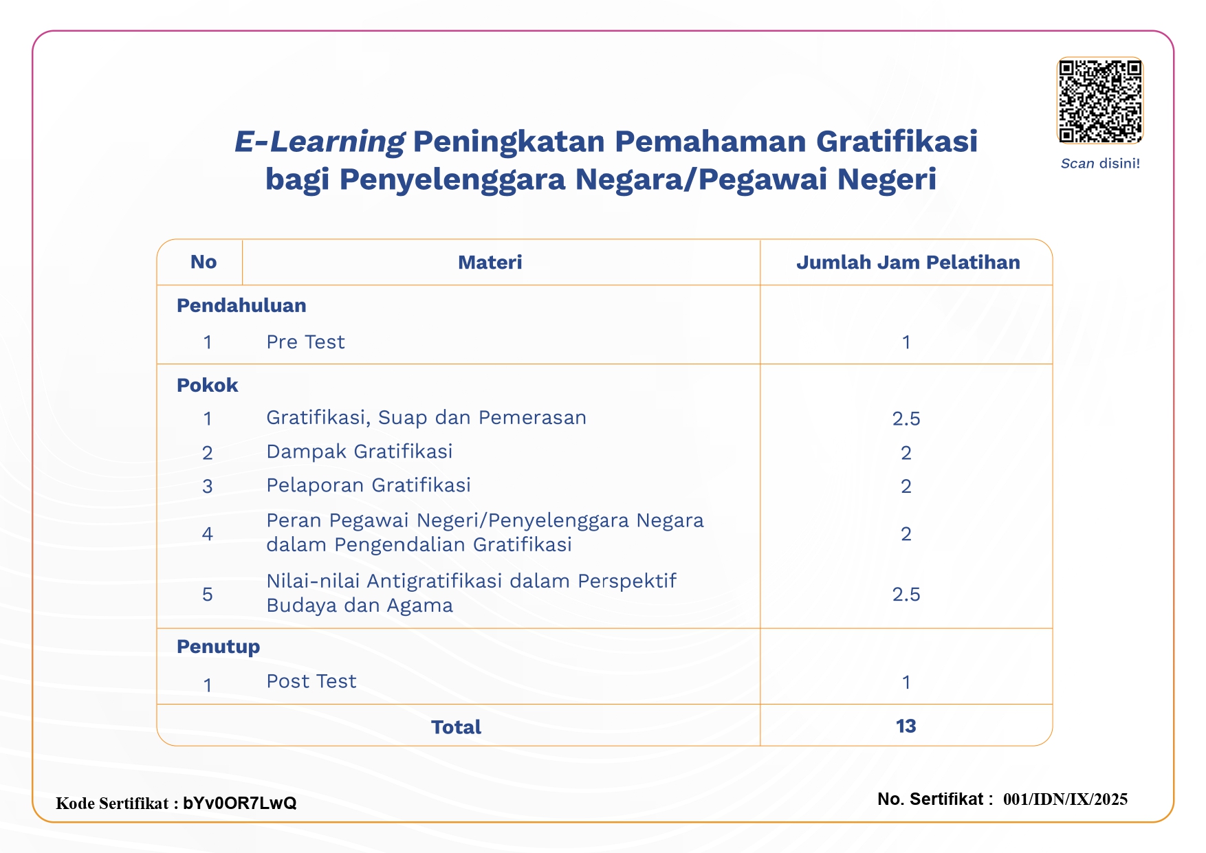 Kegiatan ini merupakan bentuk penguatan terhadap program Zona Integritas menuju Wilayah Bebas dari Korupsi (WBK) dan Wilayah Birokrasi Bersih dan Melayani (WBBM) yang menjadi komitmen Mahkamah Agung dan seluruh satuan kerja peradilan. Semoga dengan mengikuti E-Learning ini dapat membangun budaya kerja yang berlandaskan integritas, transparansi, dan akuntabilitas, dan memberikan dampak positif terhadap peningkatan kualitas pelayanan publik dan penguatan sistem pencegahan korupsi di lingkungan satuan kerja.