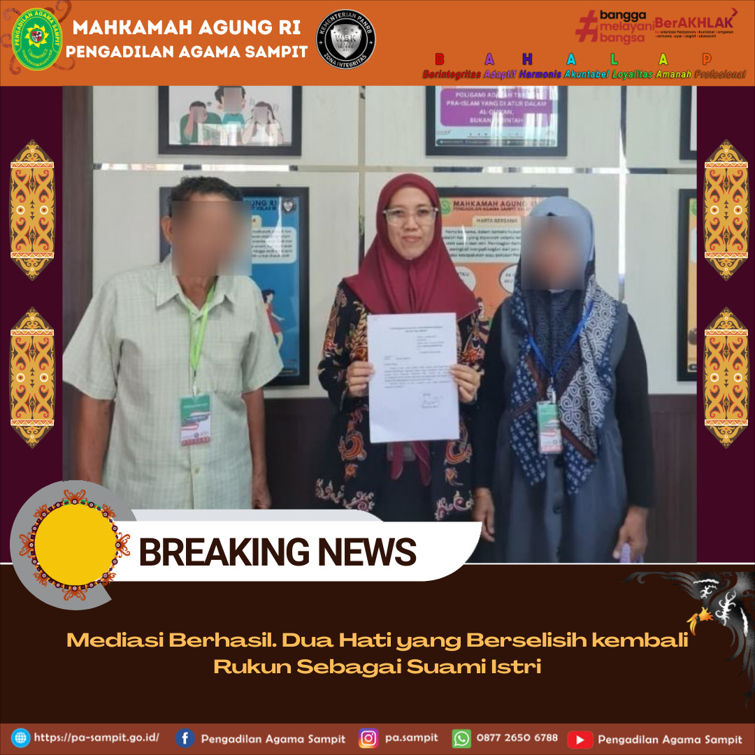 Pada hari Kamis Tanggal 2 Oktober 2025, Pengadilan Agama Sampit Kelas IB telah berhasil melaksanakan proses mediasi dalam perkara gugat cerai nomor 579/G/2025 dengan pencabutan dan rukun kembali sebagai suami istri. Pengadilan Agama Sampit Kelas IB sangat mengapresiasi kepada mediator hakim dan mediator non hakim yang didalam proses mediasi tersebut berlangsung secara profesional dan berimbang.