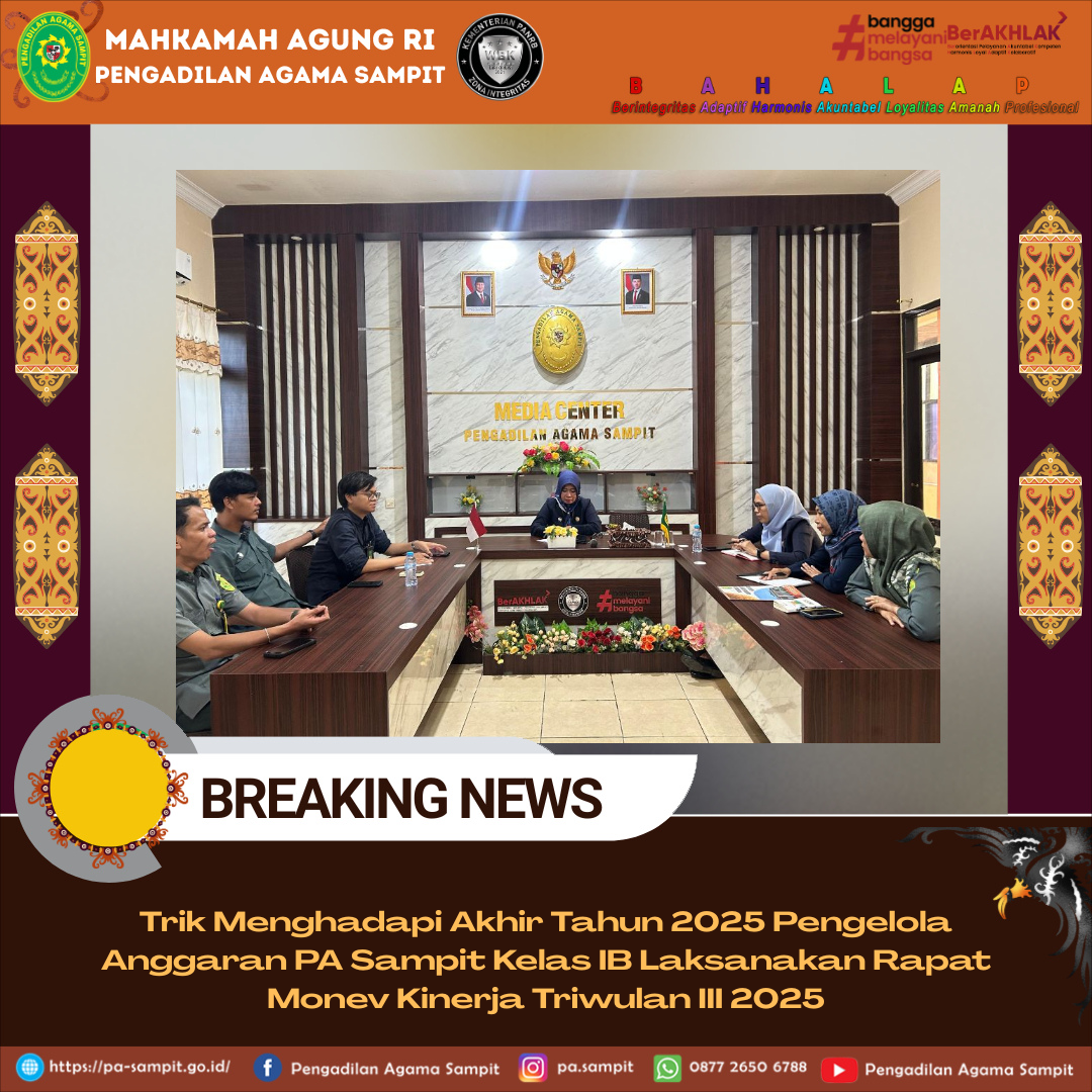 Selasa, 07 Oktober 2025 pukul 15.00 WIB Sekretaris Pengadilan Agama Sampit Isnaniyah, S.Ag. mengadakan Rapat Monitoring dan Evaluasi Kinerja Pengelola Anggaran Triwulan III tahun 2025 bertempat di Ruang Media Center Pengadilan Agama Sampit. Sekretaris yang juga selaku Kuasa Pengguna Anggaran (KPA) dan Pejabat Pembuat Komitmen (PPK) memimpin langsung rapat tersebut. Rapat dihadiri oleh Raudah, S.H. selaku Pejabat Penguji Surat Perintah Membayar (PPSPM), Umi Watini, A.Md. selaku Bendahara Pengeluaran, Fahmi Fardiansyah, S.H. pelaksana tugas Bendahara Penerimaan serta Dwira Kurnianto Widodo, S.T. dan Linda Arianti S.Pi. selaku staf pengelola anggaran.