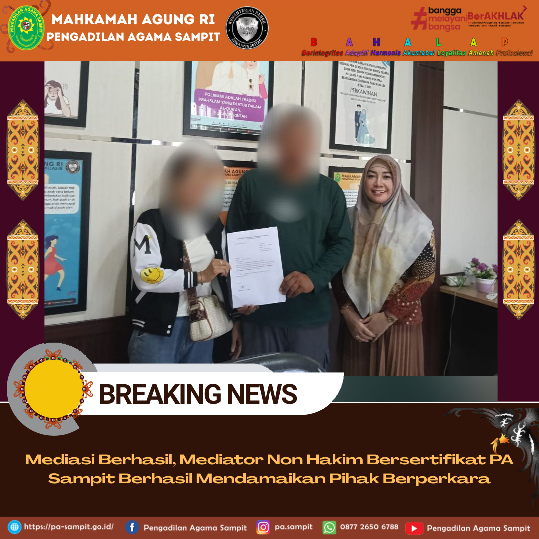 Rabu, (08/10/2025) Kabar baik datang dari Ruang Mediasi Pengadilan Agama Sampit. Mediator non hakim bersertifikat, Noor Isna, S.E., CPM, berhasil mendamaikan para pihak berkara dalam perkara cerai talak dengan Nomor 525/Pdt.G/2025/PA.Spt melalui proses mediasi. Berkat kegigihannya dalam memediasi mediator Noor Isna, S.E., CPM., pasangan suami-istri yang mengajukan permohonan cerai berhasil mencapai kesepakatan damai dan akan menarik kembali gugatannya. Keberhasilan ini menunjukkan dedikasi dan profesionalisme mediator dalam menjalankan perannya sebagai penengah yang netral dan berorientasi pada perdamaian. Adanya proses mediasi dalam kasus perceraian merupakan tahapan wajib yang diatur oleh Peraturan Mahkamah Agung (PERMA) Nomor 1 Tahun 2016, dimana jika kedua belah pihak berperkara hadir dalam persidangan.
