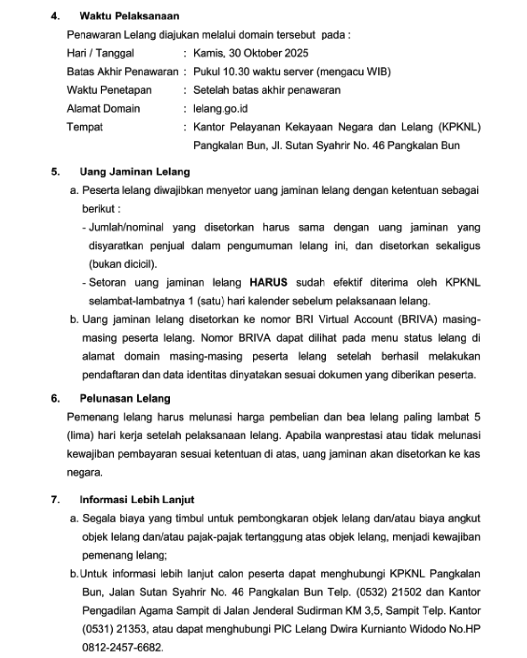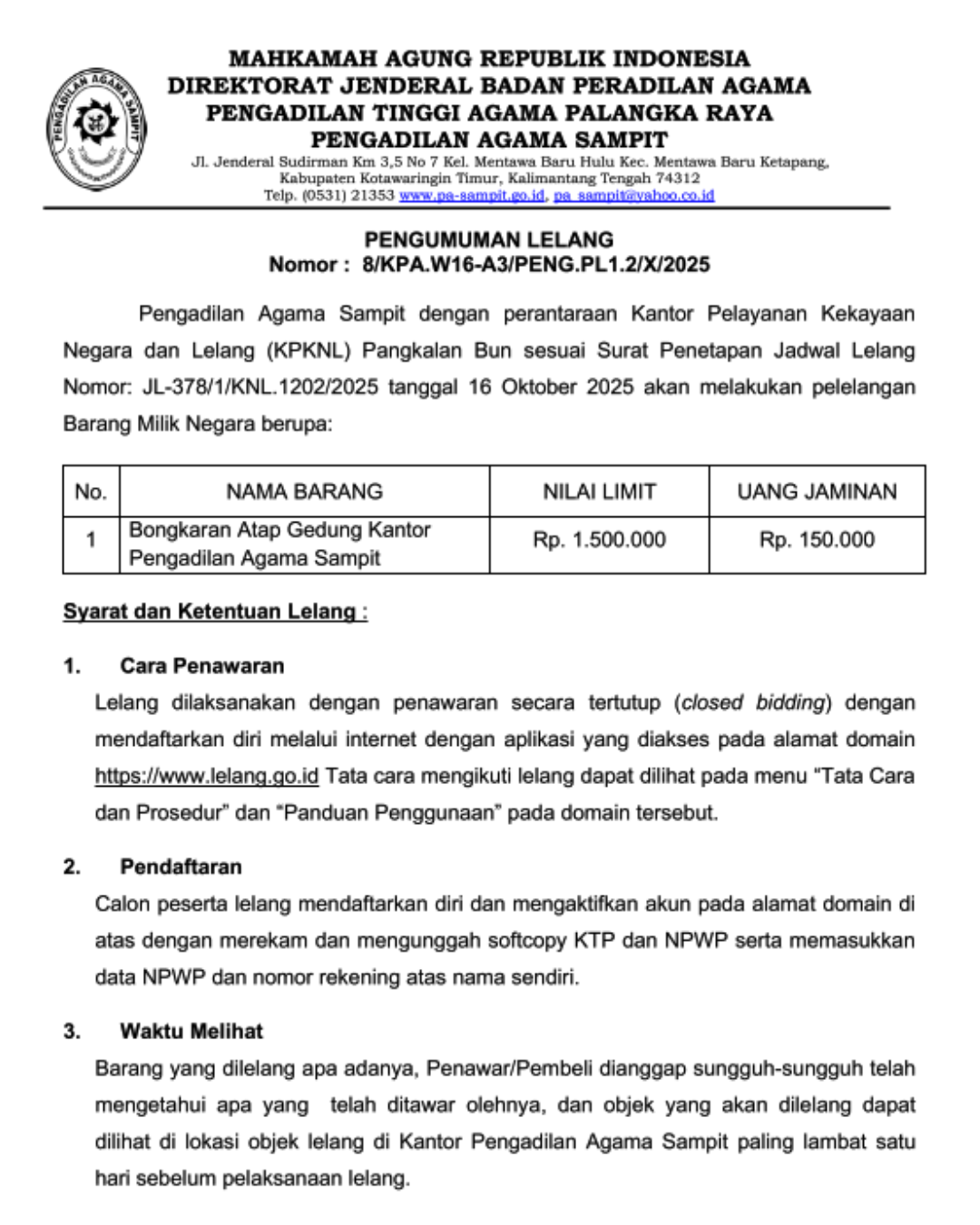 Pengadilan Agama Sampit dengan perantaraan Kantor Pelayanan Kekayaan Negara dan Lelang (KPKNL) Pangkalan Bun sesuai Surat Penetapan Jadwal Lelang Nomor: JL-378/1/KNL.1202/2025 tanggal 16 Oktober 2025 akan melakukan pelelangan Barang Milik Negara (BMN). Lelang dilaksanakan dengan penawaran secara tertutup (Closed Bidding) dengan mendaftarkan diri melalui https://lelang.go.id. Calon Peserta lelang mendaftarkan diri dan mengaktifkan akun pada alamat domain di atas dengan merekam dan mengunggah softcopy KTP dan NPWP serta memasukkan data NPWP dan nomor rekening atas nama sendiri.