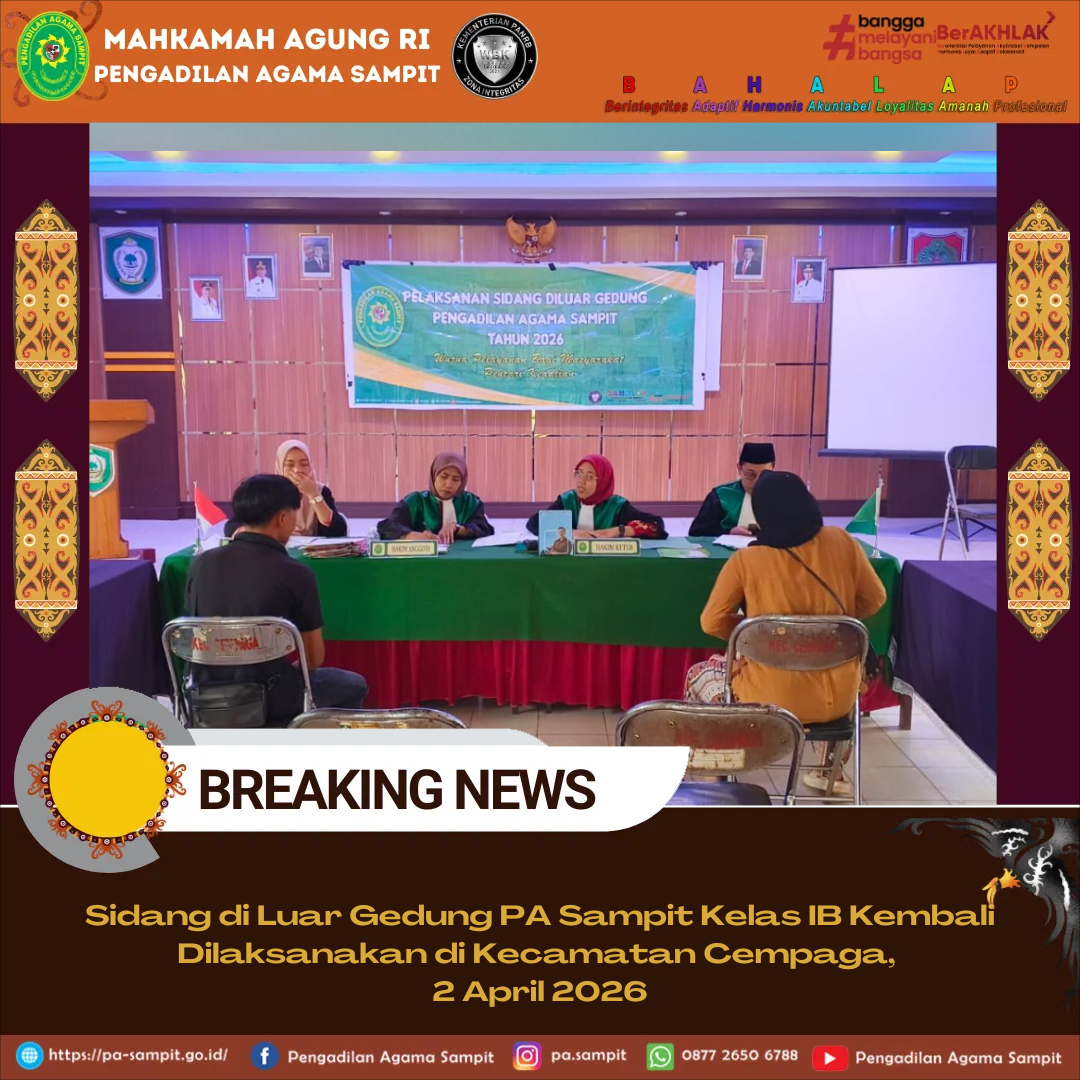 Sampit, 2 April 2026 — Pengadilan Agama Sampit Kelas IB masih melaksanakan kegiatan sidang di luar gedung sebagai bentuk komitmen dalam mendekatkan pelayanan hukum kepada masyarakat. Pada Kamis, 2 April 2026, sidang di luar gedung kembali digelar di Kantor Kecamatan Cempaga, Kabupaten Kotawaringin Timur.