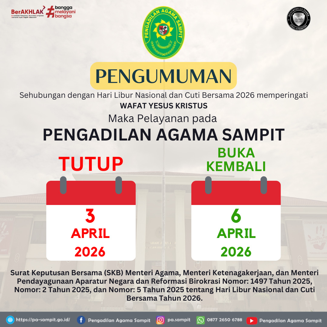 Sehubungan dengan Hari Libur Nasional dalam rangka memperingati Wafat Yesus Kristus, maka pelayanan di Pengadilan Agama Sampit Kelas IB: