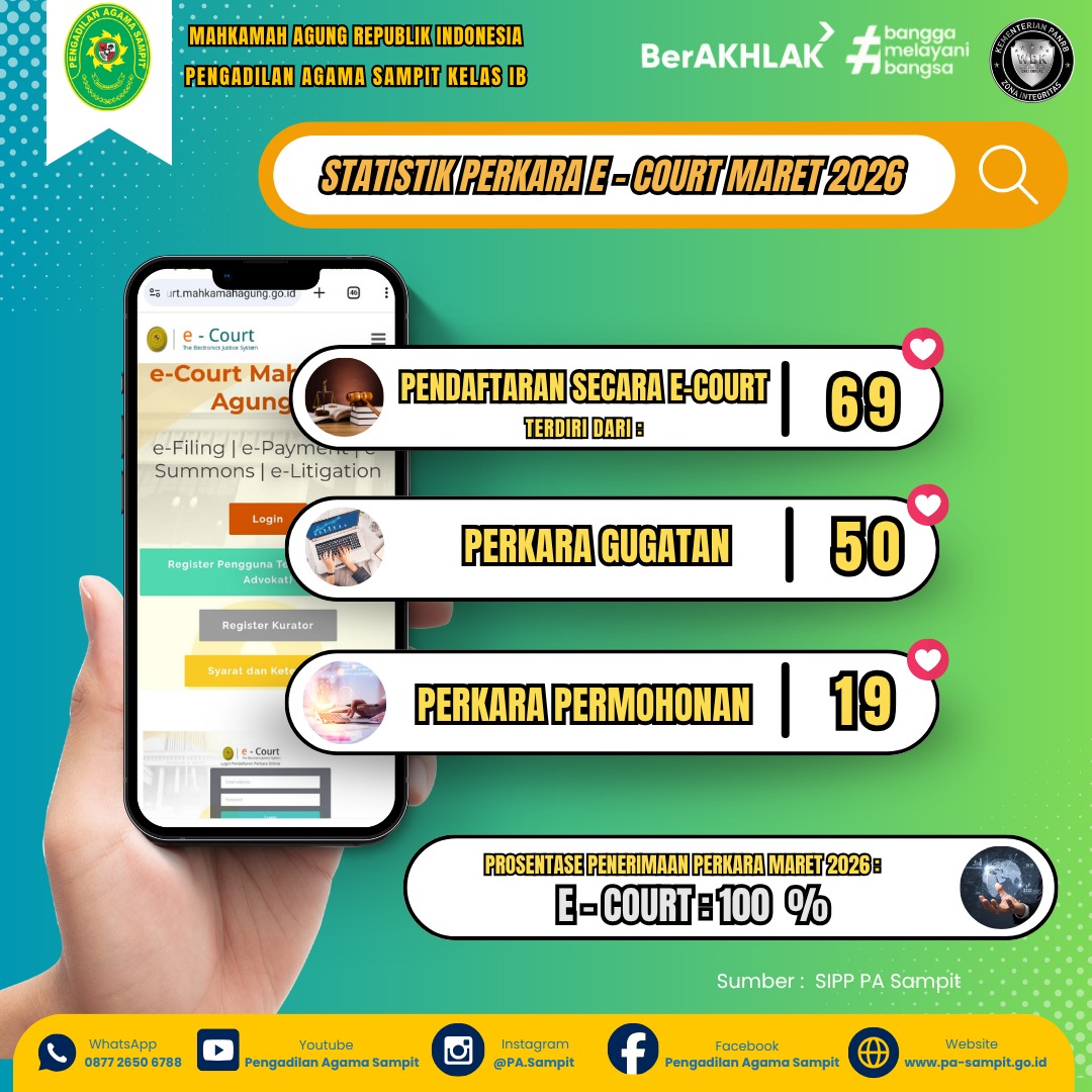 Pengadilan Agama (PA) Sampit Kelas IB terus menunjukkan komitmennya dalam transformasi digital dengan mencatatkan persentase penerimaan perkara melalui e-court sebesar 100% sepanjang bulan Maret 2026. Berdasarkan statistik terbaru, terdapat total 69 perkara yang didaftarkan secara daring melalui sistem elektronik Mahkamah Agung tersebut. Pencapaian ini menunjukkan bahwa masyarakat pencari keadilan di wilayah hukum PA Sampit telah beradaptasi dengan baik terhadap kemajuan teknologi informasi di bidang hukum.