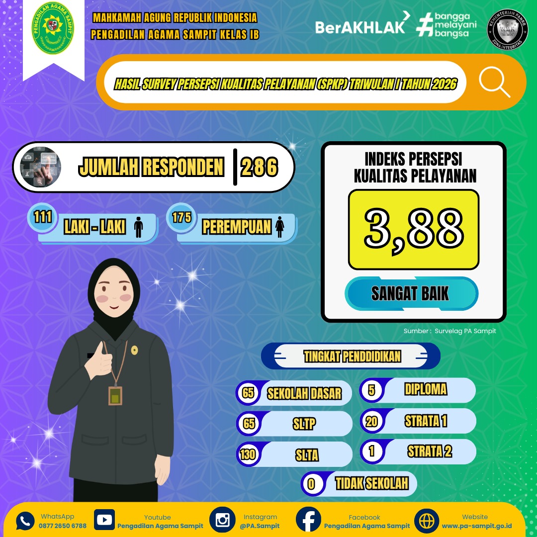 Survei tersebut melibatkan total 286 responden yang terdiri dari 111 laki-laki dan 175 perempuan. Dari sisi profil pendidikan, responden didominasi oleh lulusan SLTA sebanyak 130 orang, diikuti oleh lulusan Sekolah Dasar dan SLTP masing-masing 65 orang, serta kelompok pendidikan tinggi mulai dari Diploma hingga Strata 2. Keberagaman latar belakang responden ini menunjukkan bahwa pelayanan PA Sampit telah menjangkau dan dirasakan secara merata oleh berbagai lapisan masyarakat dengan standar kepuasan yang tinggi.