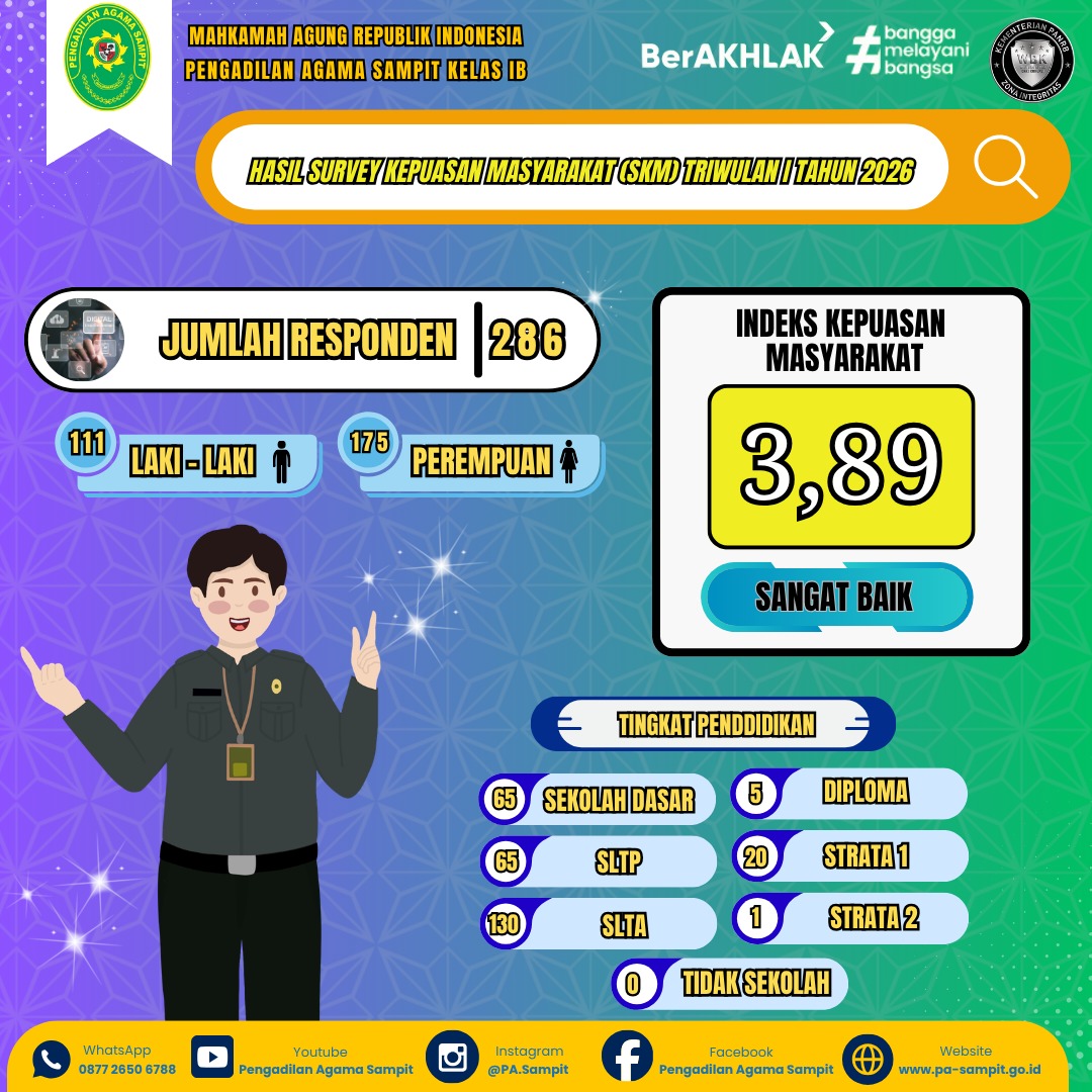 Pengadilan Agama (PA) Sampit Kelas IB kembali menunjukkan performa pelayanan publik yang impresif dengan merilis hasil Survei Kepuasan Masyarakat (SKM) untuk periode Triwulan I Tahun 2026. Berdasarkan data infografis terbaru, PA Sampit berhasil meraih nilai indeks kepuasan sebesar 3,89, yang menempatkan kualitas layanannya pada kategori "Sangat Baik". Pencapaian ini mencerminkan apresiasi positif dari para pencari keadilan atas upaya berkelanjutan institusi dalam memberikan pelayanan yang cepat, transparan, dan berorientasi pada masyarakat.