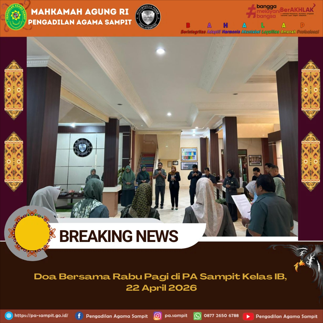 Sampit, Rabu (22 April 2026) — Pengadilan Agama Sampit Kelas IB melaksanakan kegiatan doa bersama pada Rabu pagi yang berlangsung dengan tertib dan khidmat. Kegiatan ini dipimpin oleh pegawai Ragil Tri Wicaksana dan diikuti oleh Ketua Bapak Mohammad Mahin Ridlo Afifi, S.H.I., M.H., Hakim serta seluruh aparatur Pengadilan Agama Sampit Kelas IB.