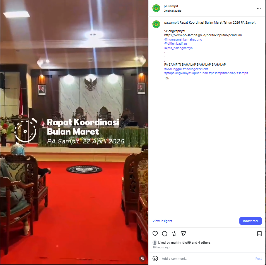 Rapat koordinasi tersebut didokumentasikan dalam bentuk video yang kemudian dipublikasikan melalui media sosial resmi PA Sampit. Dokumentasi ini menjadi sarana transparansi informasi sekaligus media publikasi yang efektif untuk menyampaikan kegiatan dan kinerja satuan kerja kepada masyarakat luas.