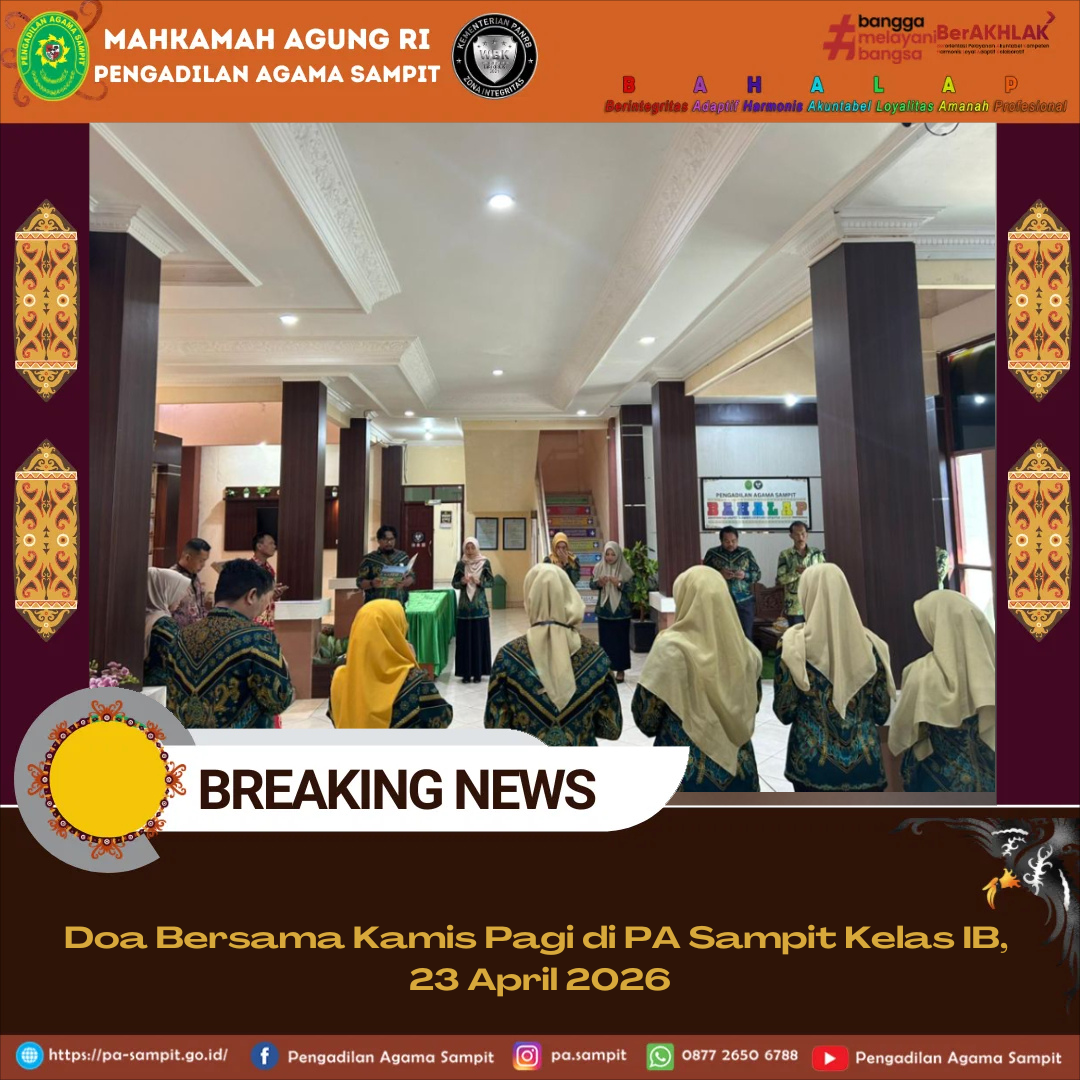 Sampit, Kamis (23 April 2026) — Pengadilan Agama Sampit Kelas IB melaksanakan kegiatan doa bersama pada Kamis pagi yang berlangsung dengan tertib dan khidmat. Kegiatan ini dipimpin oleh pegawai Hery Anshori dan diikuti oleh Ketua Bapak Mohammad Mahin Ridlo Afifi, S.H.I., M.H., Hakim, Pejabat Fungsional dan Struktural, serta seluruh aparatur Pengadilan Agama Sampit Kelas IB.