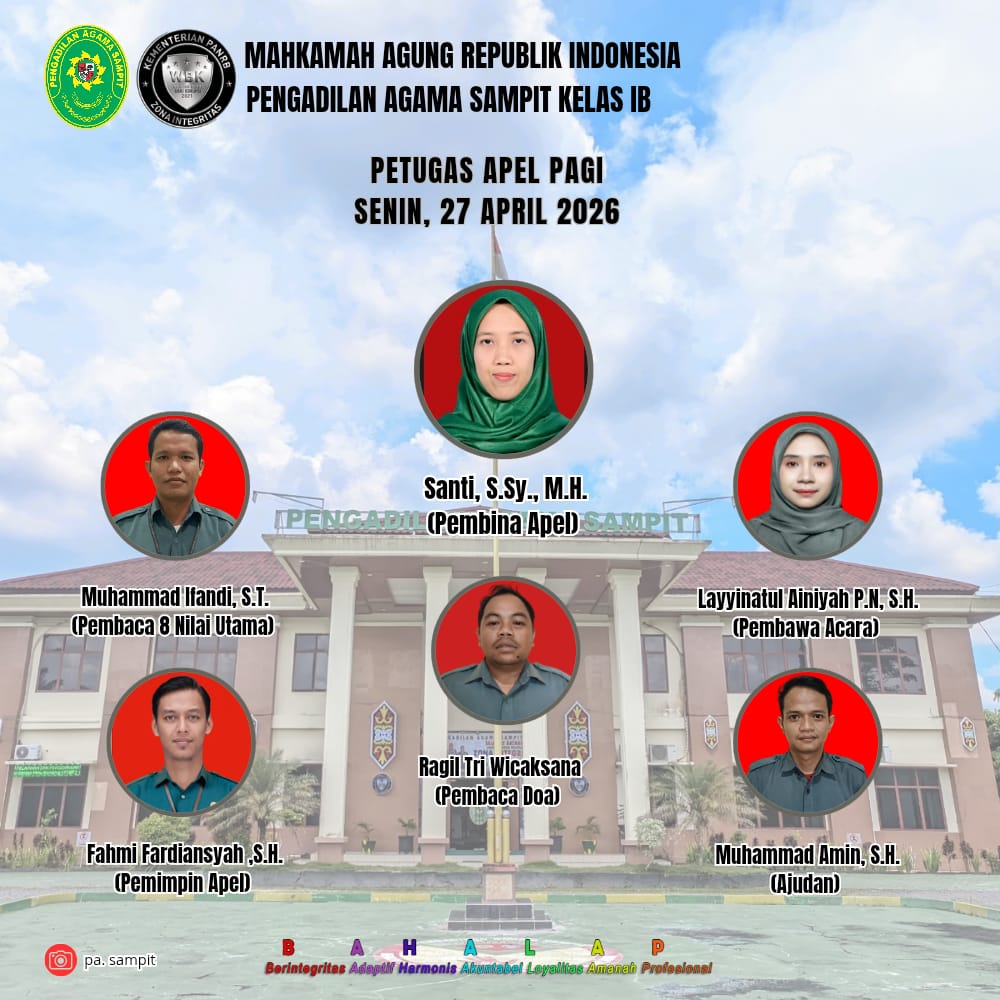 Sampit, 27 April 2026 — Pengadilan Agama Sampit Kelas IB menetapkan daftar petugas apel Senin pagi yang akan bertugas dalam pelaksanaan apel rutin pekanan.