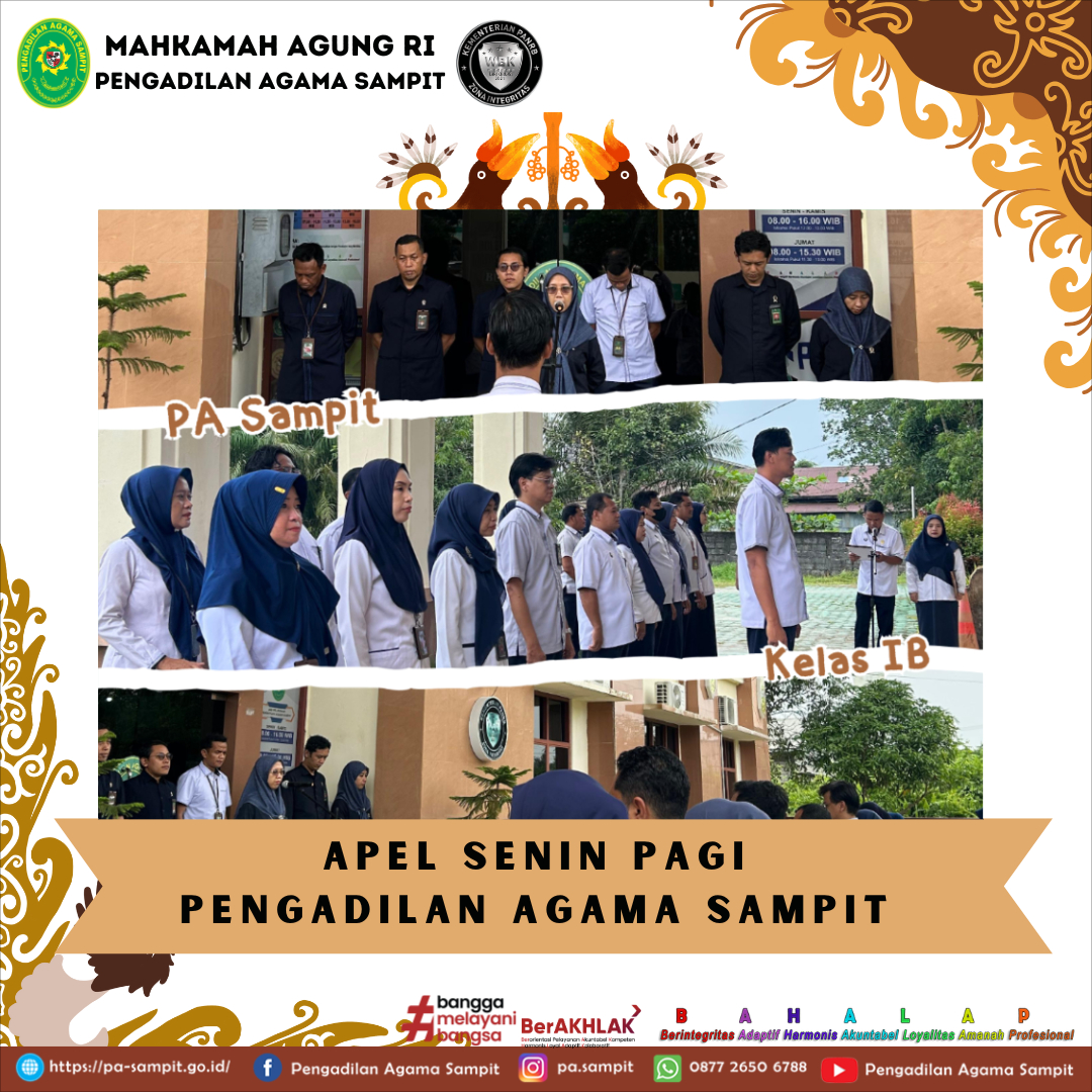 Sampit, Senin, 27 April 2026 pukul 08.00 WIB, bertempat di teras depan kantor Pengadilan Agama Sampit Kelas IB, telah dilaksanakan Apel Senin Pagi yang rutin. Apel diikuti oleh Pimpinan, para Hakim, pejabat struktural dan fungsional, staf, PPPK, seluruh pegawai Pengadilan Agama Sampit.