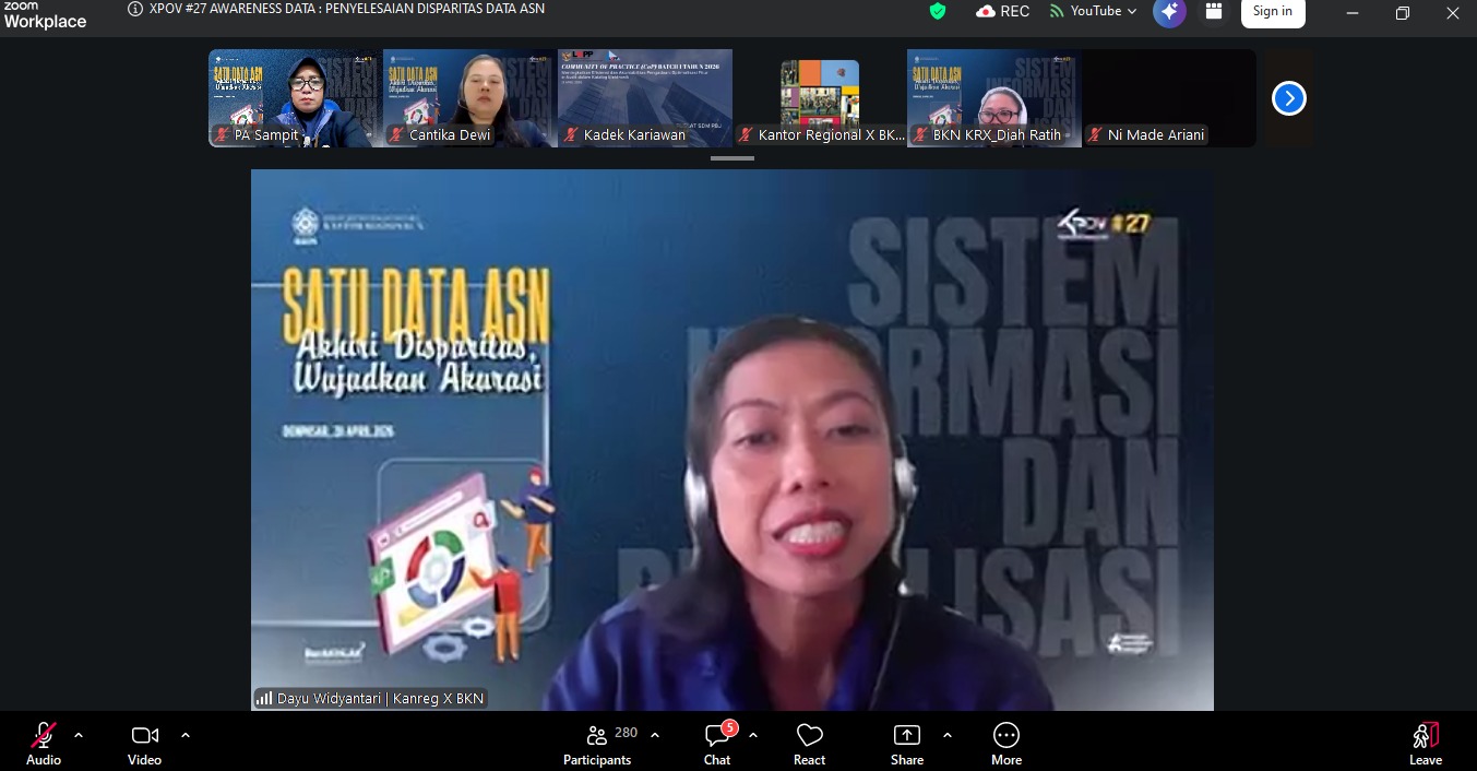 Kemudian dengan dipandu oleh Moderator Cantika Dewi, disampaikan materi oleh Narasumber Ari Windra Nata (Pranata Komputer Ahli Muda) dan Dinda Pradnya Pramita (Pranata Komputer Ahli Muda) tentang Disparitas ASN adalah perbedaan signifikan antara data kepegawaian riil di lapangan dengan data yang tercatat dalam Sistem Informasi Aparatur Sipil Negara (SIASN) BKN. Masalah ini mencakup ketidaksesuaian NIK, unit kerja, atau riwayat jabatan, yang dapat menghambat layanan administrasi kepegawaian dan karier.