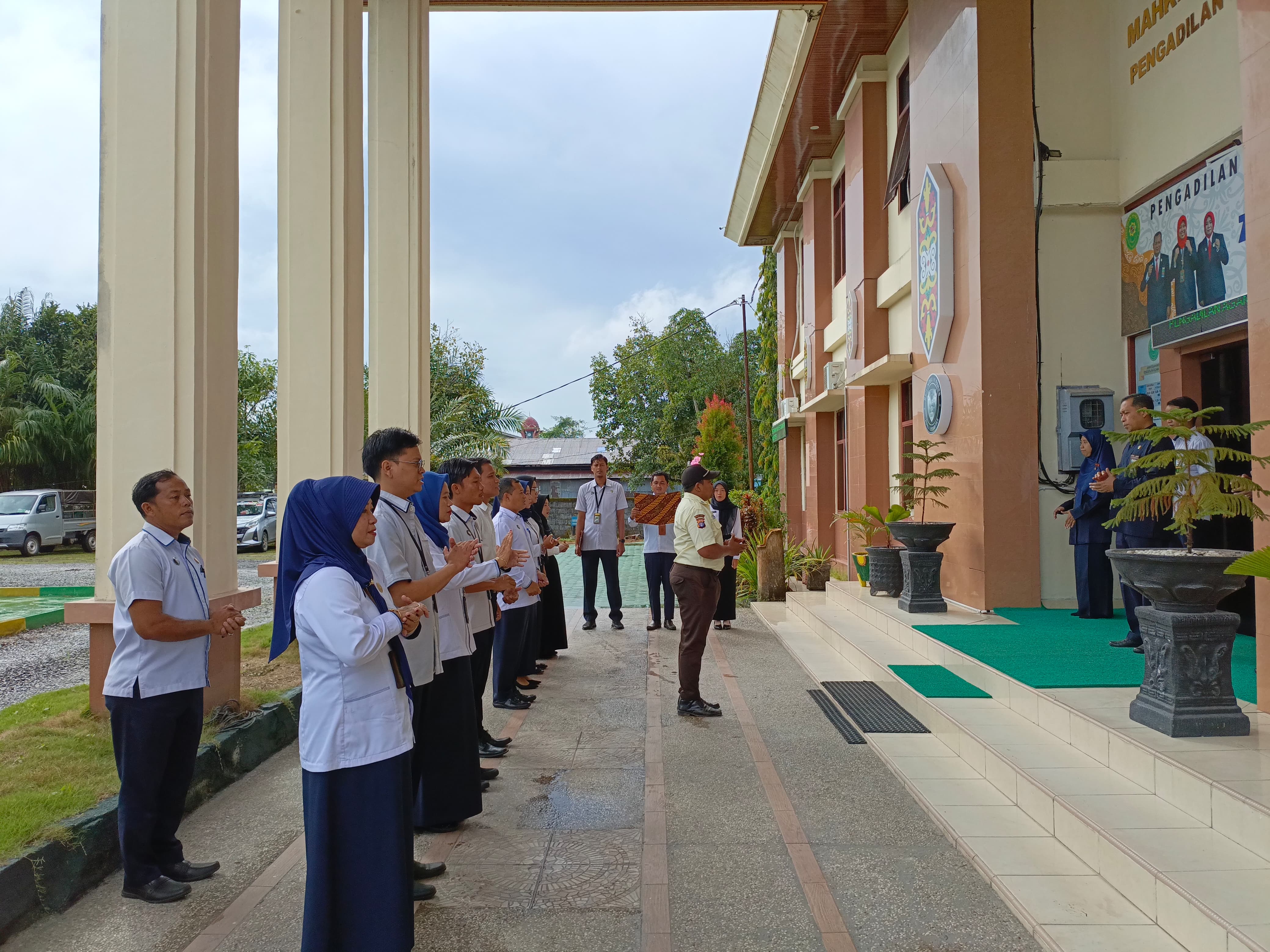 Pemandangan rutin setiap hari Senin yaitu pelaksaan Apel Senin Pagi (30/6/2025). Kegiatan ini dilaksanakan di halaman Kantor Pengadilan Agama Sampit yang diikuti oleh Hakim dan Aparatur. Dalam apel kali ini Satpam Ragil Tri Wicaksana bertugas sebagai komandan apel dan Ketua PA Sampit Bapak Mohammad Mahin Ridlo Afifi, S.H.I., M.H., bertindak sebagai pembina apel. Disisi lain petugas yang kali ini bertugas dengan MC Bunga Setymika, SH., Pembaca 8 Nilai Utama MA Bapak Apriansyah, S.H., dan Fahmi Fardiansyah, S.H., bertugas sebagai pembaca doa.