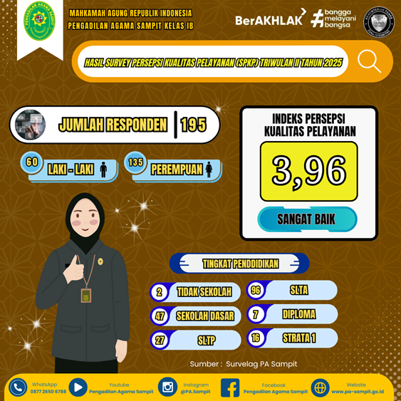 Hasil ini menunjukkan bahwa mayoritas pengguna layanan merasa puas dan menilai PA Sampit telah memenuhi standar pelayanan yang baik. Pengadilan Agama Sampit terus berkomitmen dalam mendorong masyarakat pencari keadilan atau penerima layanan Pengadilan Agama Sampit untuk dapat berperan aktif dalam pengisian survei SPKP setiap triwulan sebagai bentuk partisipasi dalam mewujudkan lembaga peradilan yang semakin modern, akuntabel, dan berorientasi pada pelayanan publik yang prima.