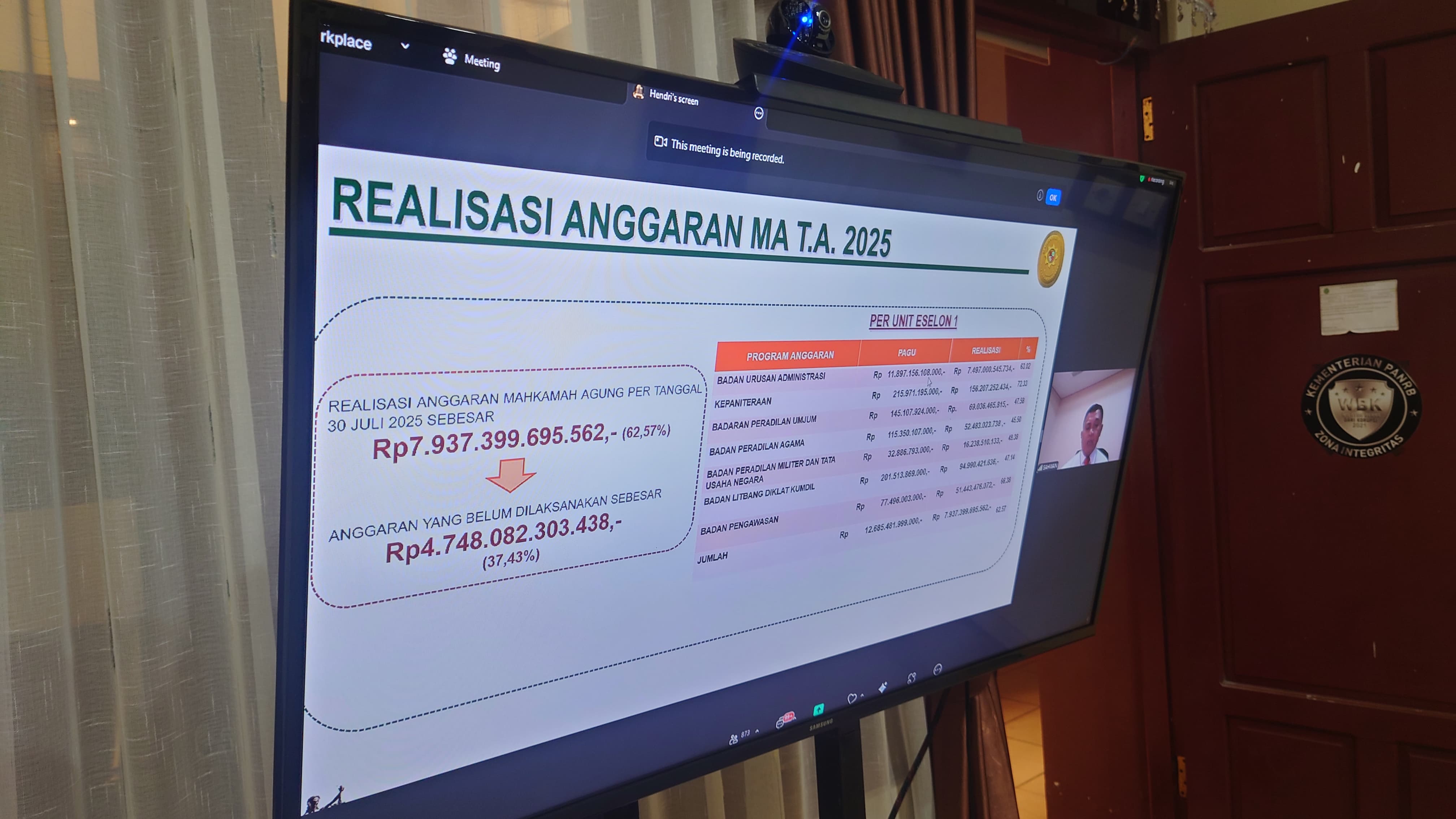 Bertempat di media center PA Sampit, Kasubbag PTIP Ibu Raudah, S.H., didampingi Bendahara Pengeluaran Ibu Umi Watini, A.Md mengikuti kegiatan Rapat Persiapan Pelaksanaan Penyusunan RKA-K/L Pagu Anggaran TA 2026 secara daring. Acara ini diadakan oleh BUA Mahkamah Agung RI yang dimulai dari jam 09.00-selesai WIB.