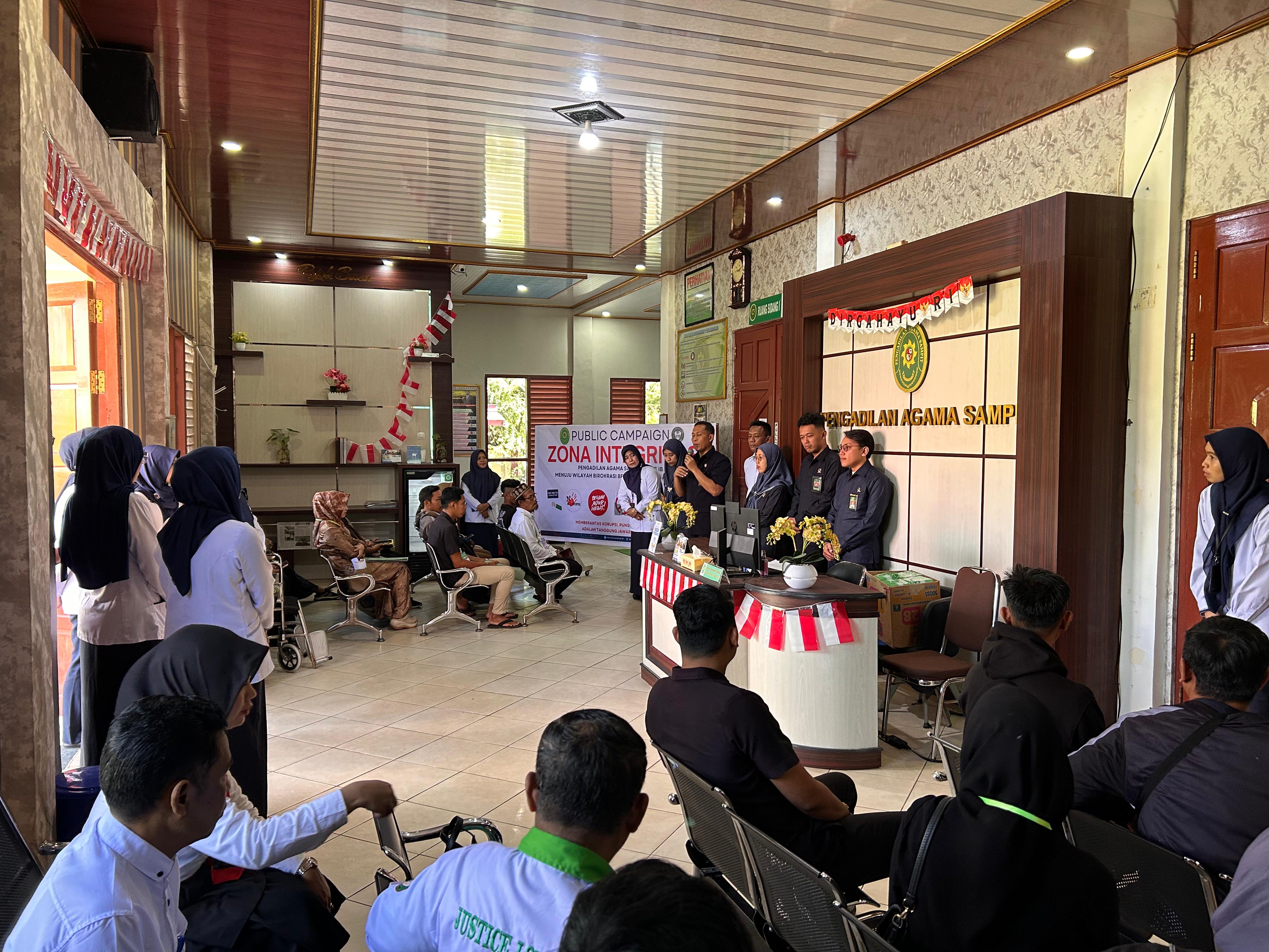Pengadilan Agama Sampit kembali melaksanakan public campaign pembangunan zona integritas Menuju Wilayah Birokrasi Bersih dan Melayani (WBBM). Kegiatan ini dilaksanakan pada hari Senin, 11 Agustus 2025 bertempat di salah satu area pelayanan yaitu Ruang Tunggu Sidang Pengadilan Agama Sampit. Seluruh aparatur Pengadilan Agama Sampit dari pimpinan, hakim, Pejabat Fungsional, Pejabat Struktural, Staf Pelaksana, CPNS, PPNPN, Honorer dan siswa PKL turun langsung dalam kegiatan ini.