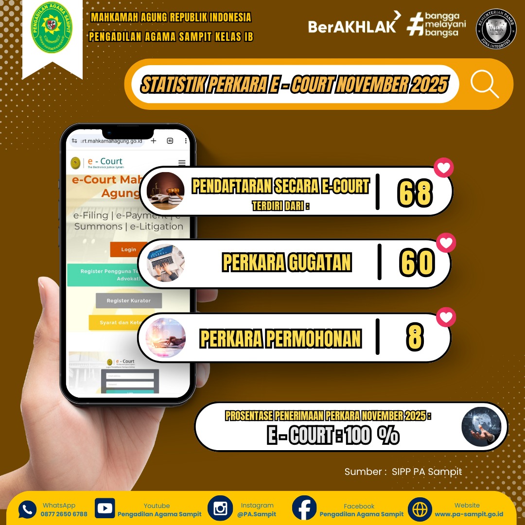 Sampit – Pengadilan Agama Sampit Kelas IB kembali menunjukkan komitmennya dalam mendukung transformasi digital layanan peradilan melalui penerapan sistem e-Court. Berdasarkan data yang dihimpun dari Sistem Informasi Penelusuran Perkara (SIPP), seluruh pendaftaran perkara pada bulan November 2025 tercatat dilakukan secara elektronik atau mencapai 100% penggunaan layanan e-Court.