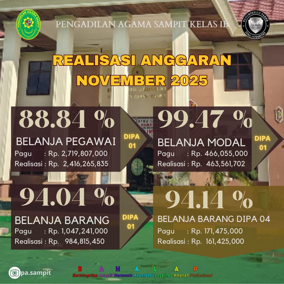 Pengadilan Agama Sampit Kelas IB kembali merilis data realisasi anggaran per November 2025. Berdasarkan laporan tersebut, capaian realisasi anggaran menunjukkan progres positif dengan persentase penyerapan yang tinggi pada seluruh kategori anggaran. Hal ini menjadi indikator pelaksanaan perencanaan dan penggunaan anggaran yang efektif, terkontrol, serta sesuai kebutuhan satker.
