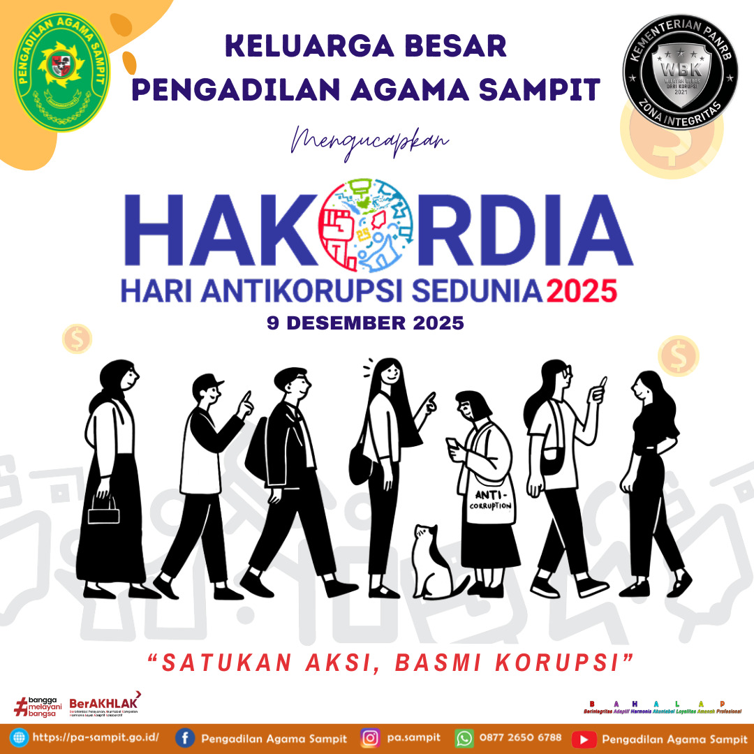 Selasa, 09 Desember 2025 sebagai bentuk komitmen untuk ikut memberantas korupsi, keluarga besar Pengadilan Agama Sampit membuat ucapan “Selamat Memperingati Hari Anti-Korupsi (HAKORDIA) Sedunia, yang selalu diperingati pada tanggal 9 Desember.