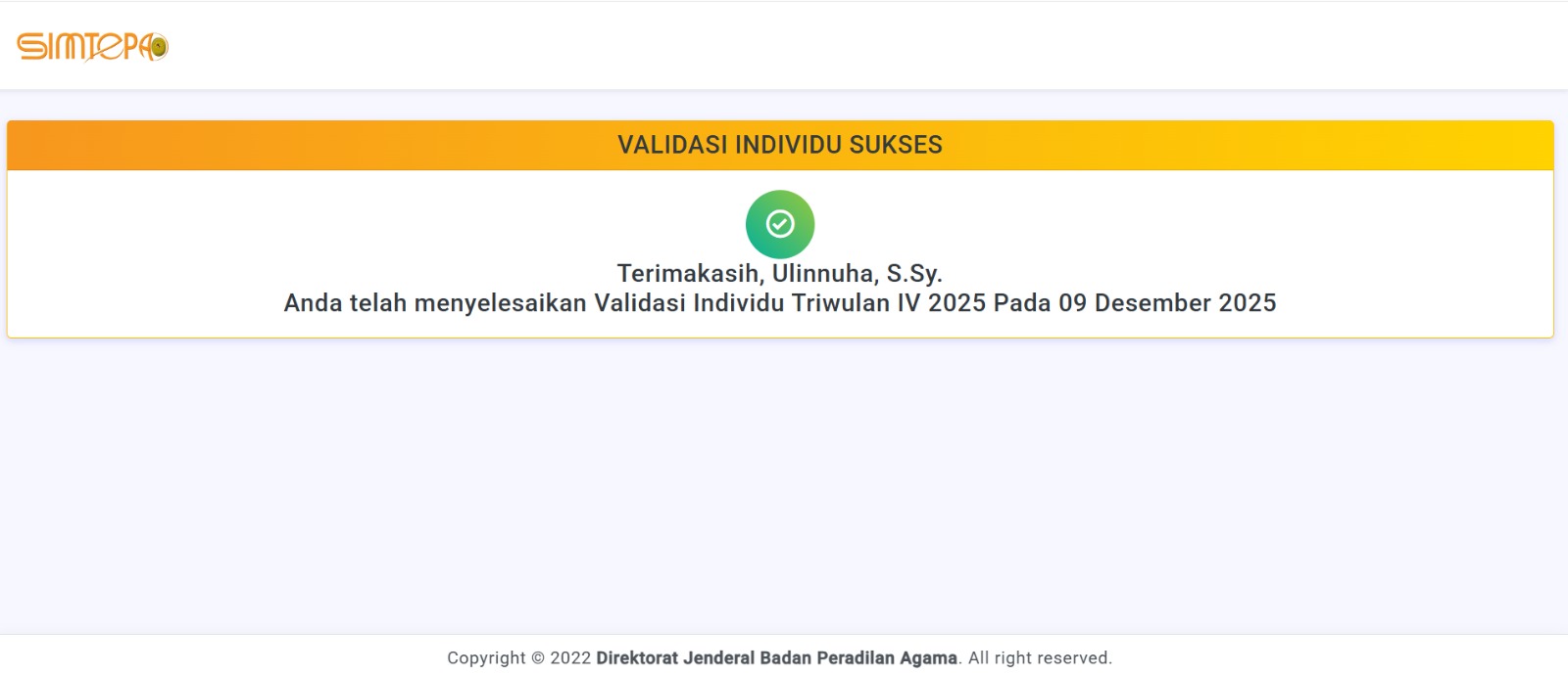 Kegiatan validasi individu dijadwalkan berlangsung pada tanggal 08 sampai dengan 17 Desember 2025 dan bertujuan memastikan seluruh data kepegawaian pegawai terupdate dan akurat, demi mendukung manajemen SDM yang efektif dan pelayanan publik yang optimal. Seperti halnya dilakukan oleh salah satu aparatur pegawai Pengadilan Agama Sampit Ulinnuha, S.Sy., turut aktif berpartisipasi dalam validasi secara tepat waktu dengan memeriksa dan memastikan semua data pribadinya serta data keluarga tercatat dengan benar di sistem SIKEP. Hal serupa juga dilakukan oleh seluruh aparatur pegawai Pengadilan Agama Sampit. Seperti yang diketahui bersama bahwasanya aplikasi SIKEP merupakan Sistem Informasi Kepegawaian Mahkamah Agung yang memuat seluruh data pegawai dan data keluarga yang tersimpan secara elektronik. Adapun kegiatan validasi individu pada aplikasi SIKEP menjadi salah satu kategori penilaian triwulan dengan ketentuan: