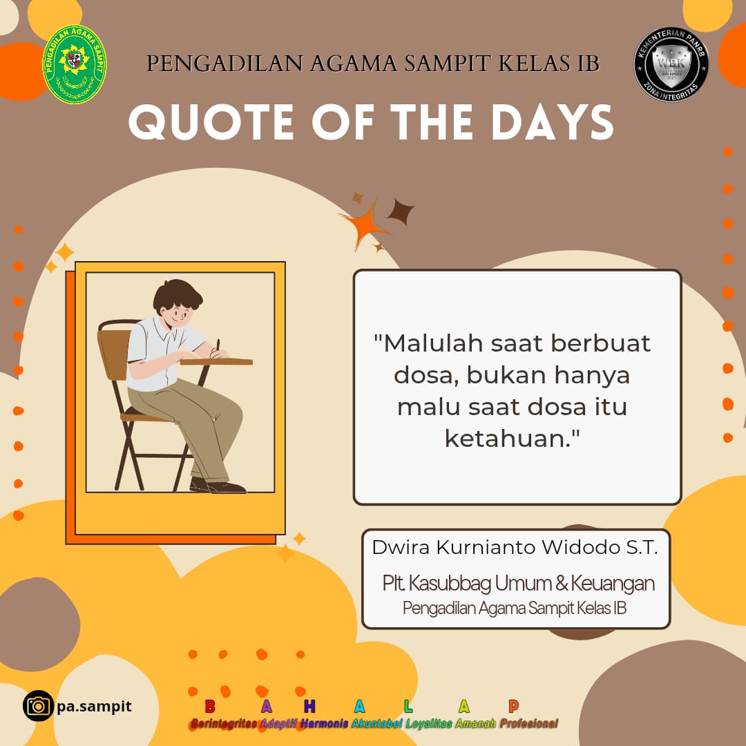 Program Quote of The Days ini merupakan bagian dari upaya Pengadilan Agama Sampit Kelas IB dalam membangun budaya kerja yang berintegritas dan berakhlak mulia. Dengan menampilkan kutipan dari para pejabat maupun pegawai, PA Sampit ingin menghidupkan lingkungan kerja yang saling menginspirasi serta meneguhkan nilai-nilai BAHALAP: Berintegritas, Adaptif, Harmonis, Akuntabel, Loyalitas, Amanah, Profesional.