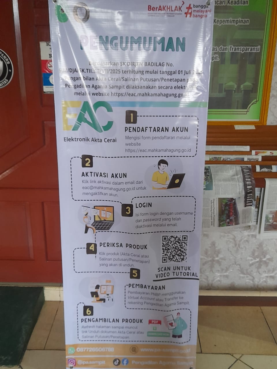 Pengadilan Agama Sampit Kelas IB terus memberikan inovasi pelayanan publik berbasis digital. Hal ini terlihat dari pemasangan banner resmi mengenai layanan Elektronik Akta Cerai (E-AC), sebuah sistem yang memungkinkan masyarakat melakukan pengambilan Akta Cerai, salinan putusan, maupun penetapan secara online. Pemberlakuan layanan ini mengikuti SK Dirjen Badilag No. 052/DJA/SK.TII/SK.TIII/2025 yang efektif dimulai pada 1 Juli 2025.