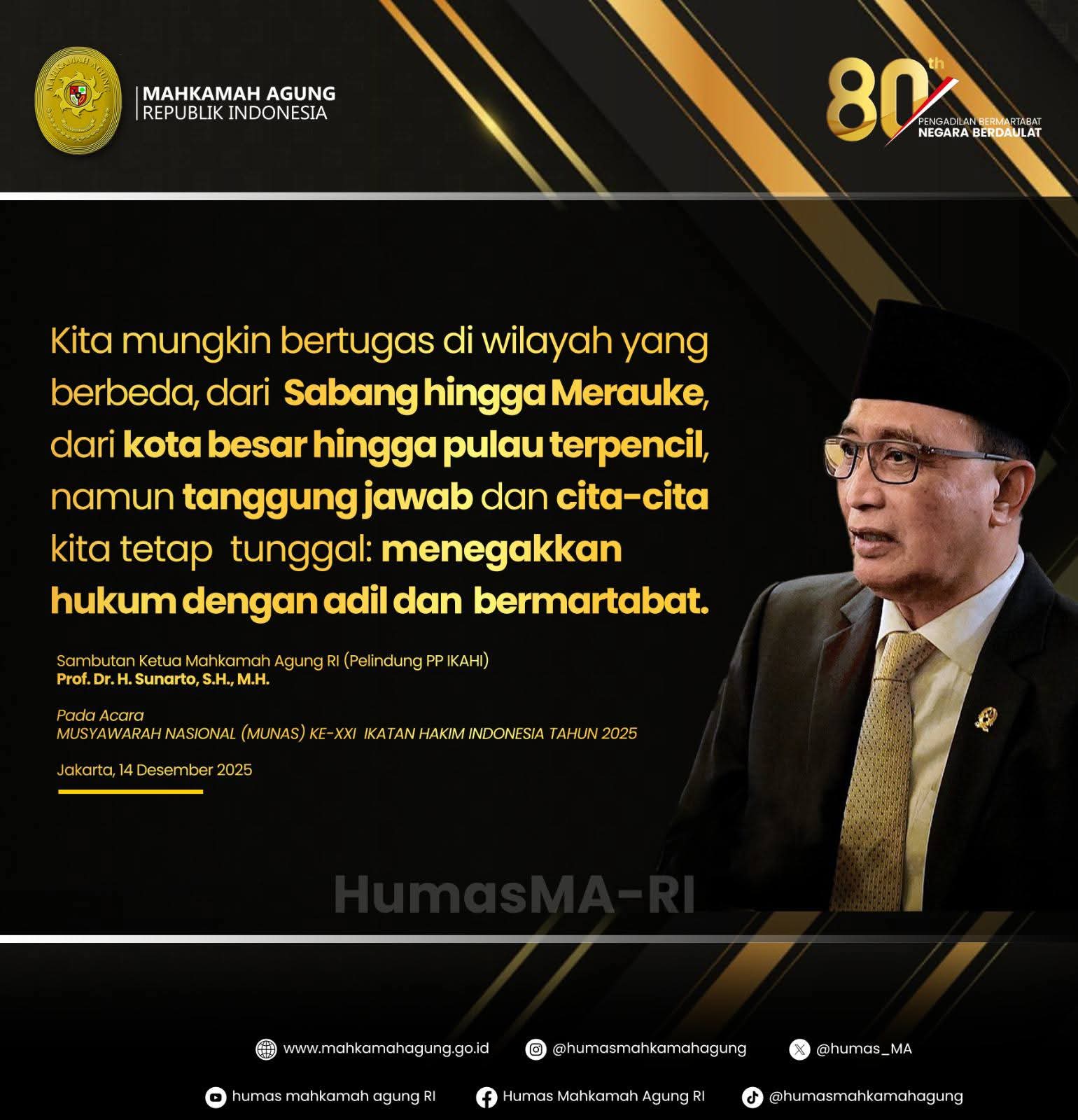 Acara Munas ke-XXI IKATAN HAKIM INDONESIA TAHUN 2025 ini menjadi momentum penting untuk merefleksikan kembali peran strategis hakim dan memperkuat komitmen bersama dalam menjamin kedaulatan hukum dan mewujudkan negara yang berdaulat, sejalan dengan tema peringatan 80 tahun Mahkamah Agung.