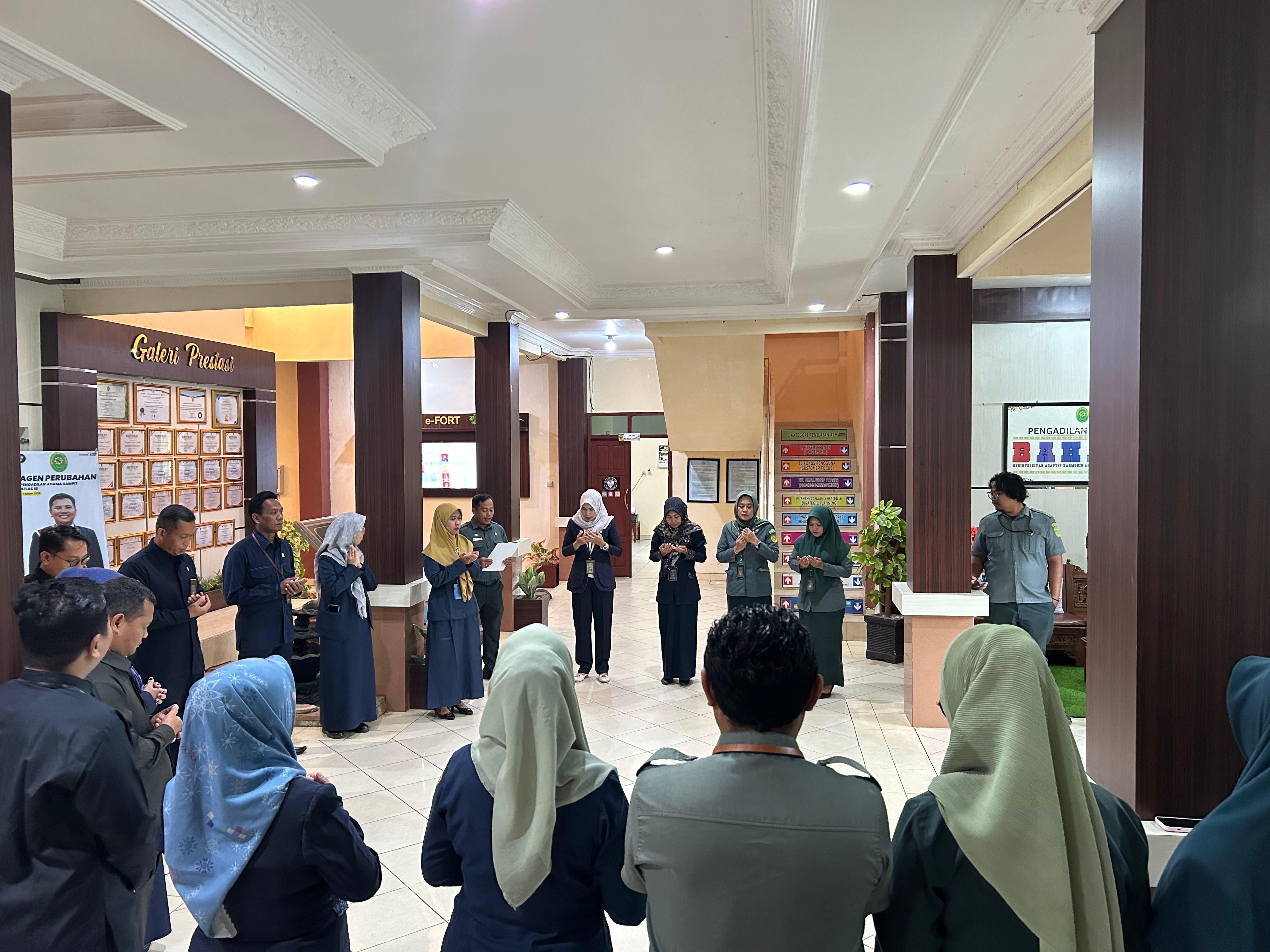 Mengawali aktivitas di hari Selasa, 16 Desember 2025, seluruh aparatur Pengadilan Agama Sampit Kelas IB melaksanakan kegiatan rutin doa bersama. Kegiatan ini menjadi momen untuk memohon kelancaran dalam menjalankan tugas sehari-hari.
