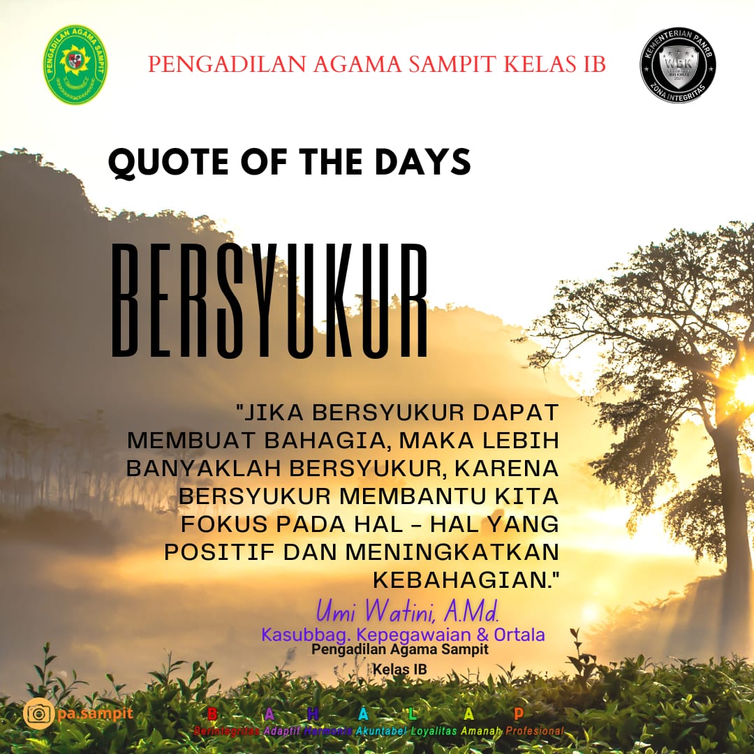 SAMPIT – Pengadilan Agama (PA) Sampit Kelas IB terus berinovasi dalam membangun budaya kerja yang positif dan harmonis di lingkungan kantor. Salah satunya melalui program harian "Quote of the Day" yang menyajikan pesan-pesan inspiratif bagi seluruh aparatur, seperti kutipan bermakna dari Kasubbag Kepegawaian dan Ortala, Ibu Umi Watini, A.Md., yang menekankan pentingnya rasa syukur dalam bekerja.