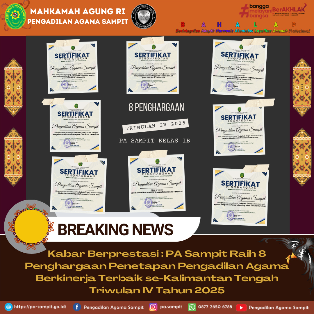 Berdasarkan Surat Keputusan Wakil Ketua Pengadilan Tinggi Agama Palangka Raya nomor : 1384/KPTA.W16-A/SK.OT1.6/IX2025 TANGGAL 19 Desember 2025 Tentang penetapan Pengadilan Agama yang Berkinerja Terbaik se-Kalimantan Tengah Triwulan IV Tahun 2025, kabar menggembirakan bagi Pengadilan Agama Sampit Kelas IB, karena telah berhasil meraih 8 Penghargaan, dengan kategori sebagai berikut :