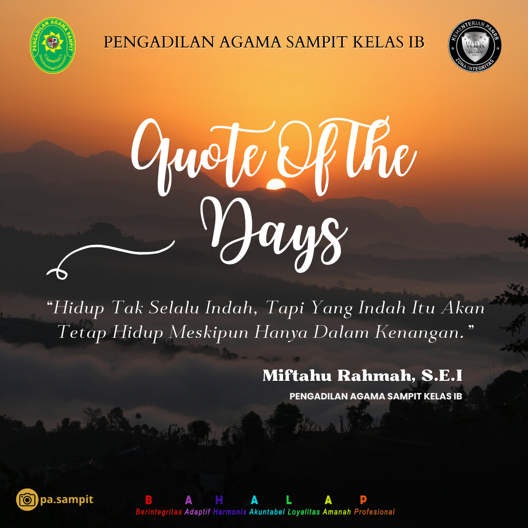 Quote yang ditampilkan berbunyi, “Hidup tak selalu indah, tapi yang indah itu akan tetap hidup meskipun hanya dalam kenangan.” Kutipan tersebut disampaikan oleh Miftahu Rahmah, S.E.I., aparatur Pengadilan Agama Sampit Kelas IB. Pesan yang disampaikan mengandung makna mendalam tentang kehidupan, keteguhan hati, serta pentingnya mensyukuri setiap proses yang dijalani.