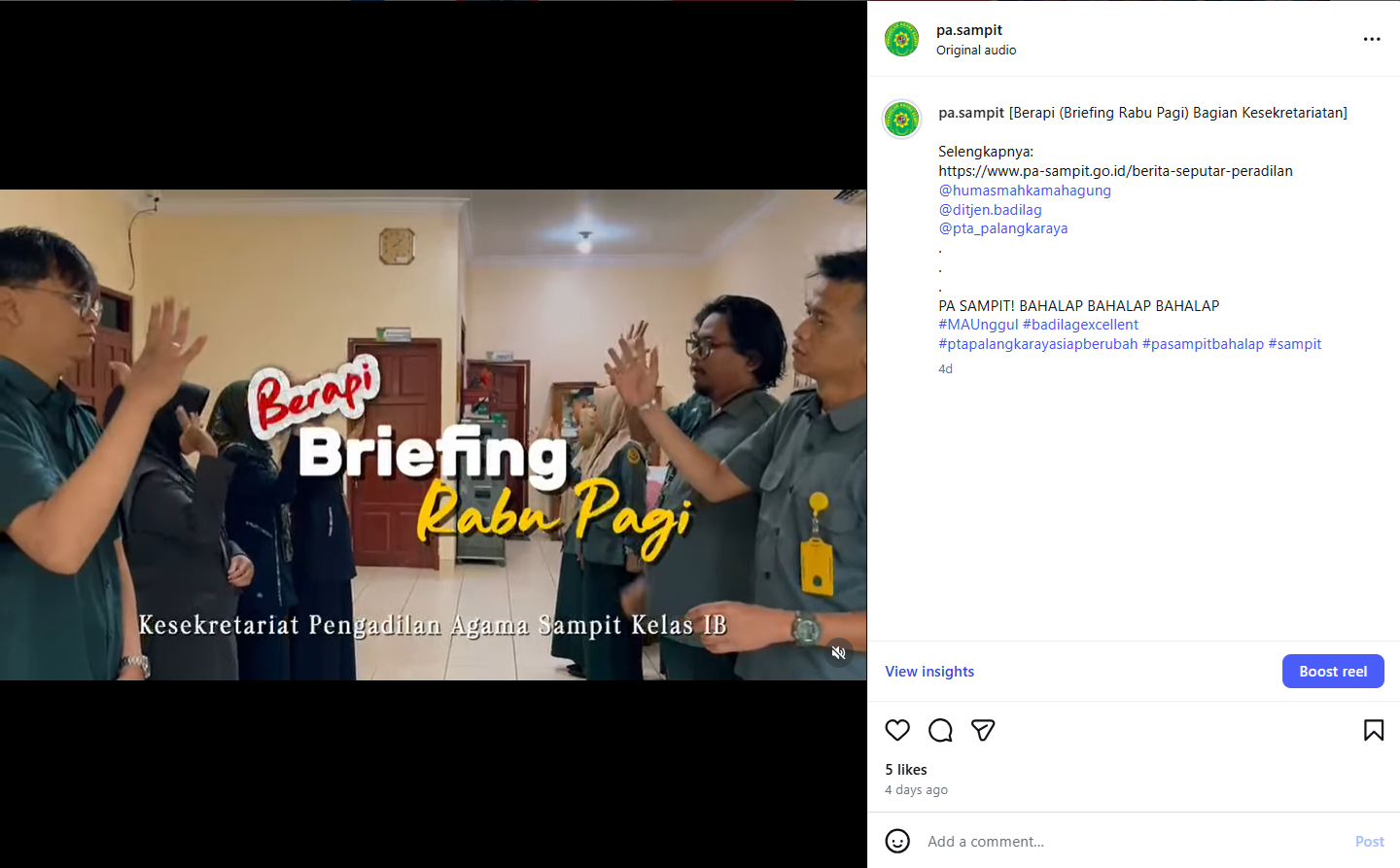 Pengadilan Agama (PA) Sampit Kelas IB terus memperkuat eksistensi digitalnya dengan mendokumentasikan setiap kegiatan dinas secara rutin ke media sosial. Salah satu yang terbaru adalah unggahan video kegiatan Berapi (Briefing Rabu Pagi) di bagian Kesekretariatan. Langkah ini diambil untuk menunjukkan kepada masyarakat bahwa setiap proses kerja di balik layar pengadilan dijalankan secara disiplin dan terorganisir dengan baik.