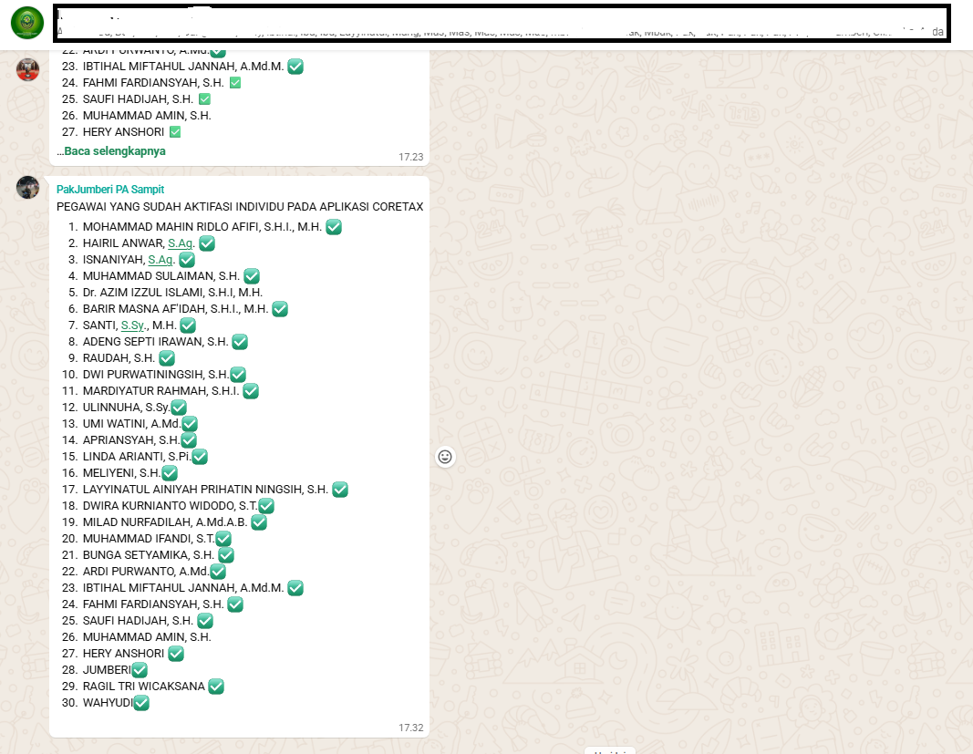 Berdasarkan laporan terkini dalam grup tersebut, tercatat 30 personil dari berbagai unsur jabatan mulai dari pimpinan, hakim, hingga staf teknis telah berhasil melakukan aktivasi. Keberadaan list digital ini memudahkan pimpinan dalam mengidentifikasi siapa saja yang telah sukses dan siapa yang masih membutuhkan pendampingan teknis.