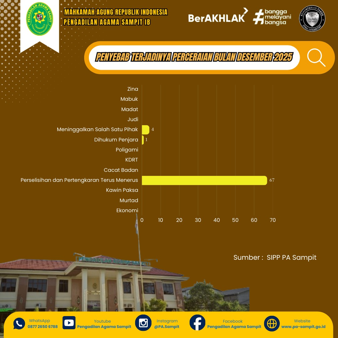 Sampit – Pengadilan Agama Sampit Kelas IB mencatat bahwa perselisihan dan pertengkaran yang terjadi secara terus menerus menjadi faktor paling dominan penyebab perceraian sepanjang Desember 2025.
