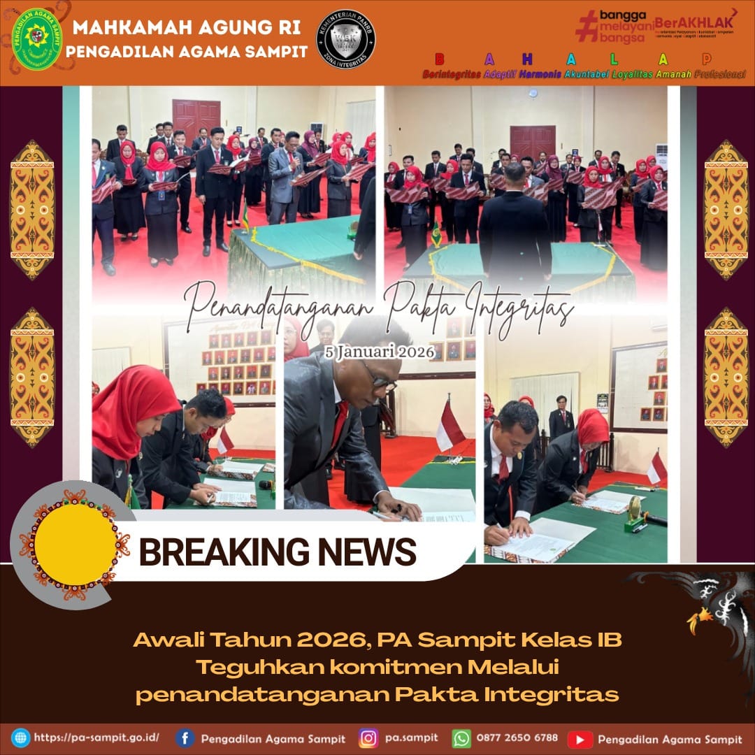 Sampit – 05 Januari 2026 pukul 13.30 WIB Pengadilan Agama Sampit melaksanakan kegiatan Penandatanganan Pakta Integritas bertempat di Ruang Aula Pengadilan Agama Sampit. Kegiatan ini dihadiri oleh seluruh Aparatur Pengadilan Agama Sampit.