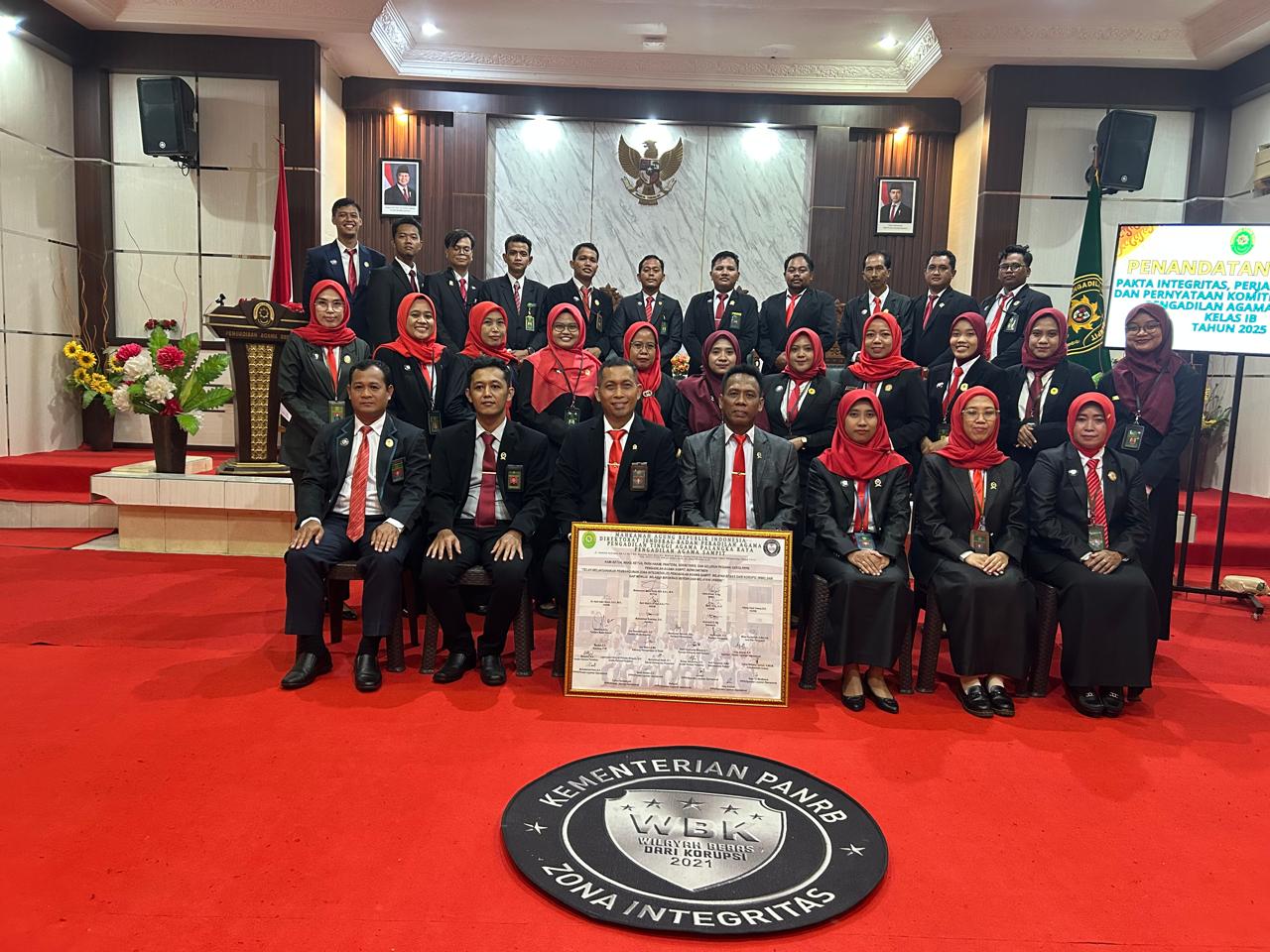 Prosesi foto bersama ini dilakukan dengan latar belakang dekorasi formal yang menonjolkan identitas "Zona Integritas" dan predikat "Wilayah Bebas dari Korupsi (WBK)" yang telah diraih sebelumnya. Seluruh aparatur yang mengenakan seragam dinas lengkap tampak menunjukkan ekspresi optimisme sebagai bentuk kesiapan menjalankan tugas dengan penuh amanah dan profesionalisme sepanjang tahun berjalan. Kehadiran papan komitmen di tengah-tengah barisan pegawai menjadi penanda bahwa setiap individu di PA Sampit memiliki tanggung jawab moral yang sama untuk menjaga marwah institusi peradilan.