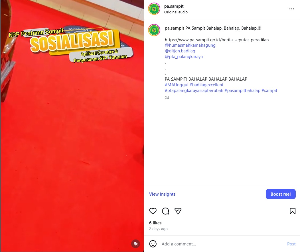 Sampit, 9 Januari 2026 – Kegiatan sosialisasi aplikasi Coretax dan penyusunan SPT Tahunan Tahun Pajak 2025 yang diselenggarakan oleh KPP Pratama Sampit di Pengadilan Agama Sampit Kelas IB pada Jumat, 9 Januari 2026, pukul 13.30 WIB, turut didokumentasikan dalam bentuk video.