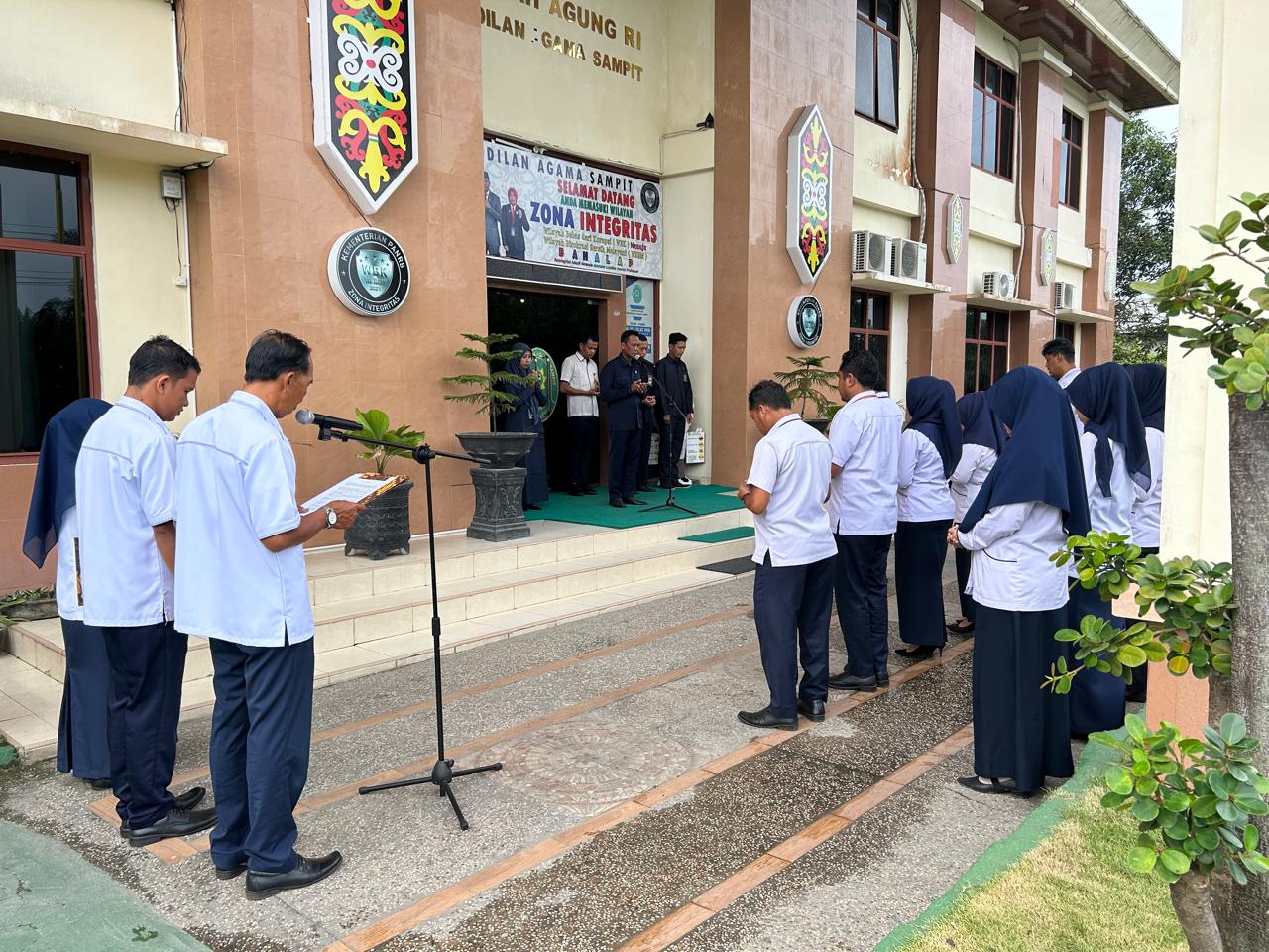 Pegawai Pengadilan Agama Sampit Kelas IB, Jumberi, memimpin doa pada kegiatan apel Senin pagi yang dilaksanakan pada 12 Januari 2026 di halaman kantor PA Sampit. Apel pagi ini diikuti oleh seluruh aparatur sebagai bagian dari rutinitas kedinasan untuk mengawali aktivitas kerja di awal pekan.