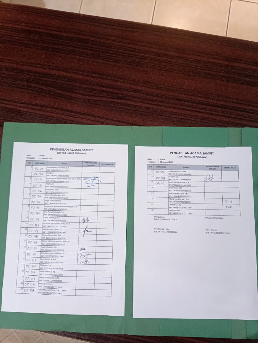 Pada Senin pagi, 12 Januari 2026, sistem absensi SIKEP mengalami gangguan teknis sehingga tidak dapat diakses sebagaimana mestinya. Menyikapi kondisi tersebut, seluruh aparatur Pengadilan Agama Sampit Kelas IB tetap melaksanakan kewajiban kehadiran dengan melakukan absensi secara manual.