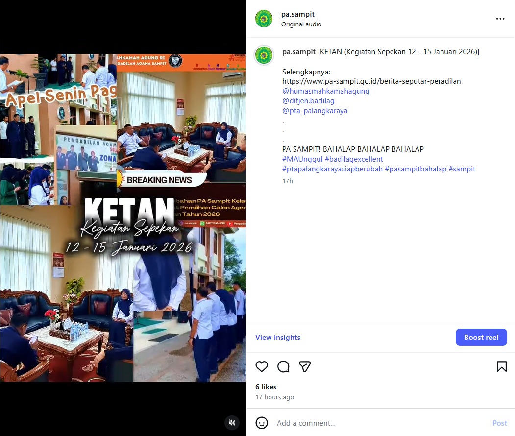 Dalam video KETAN tersebut ditampilkan berbagai rangkaian kegiatan, di antaranya pelaksanaan apel pagi, koordinasi dan rapat internal, kegiatan pelayanan peradilan, serta aktivitas penunjang lainnya yang berlangsung selama sepekan. Seluruh kegiatan tersebut mencerminkan komitmen aparatur Pengadilan Agama Sampit Kelas IB dalam menjalankan tugas dengan menjunjung tinggi profesionalisme, integritas, dan akuntabilitas.