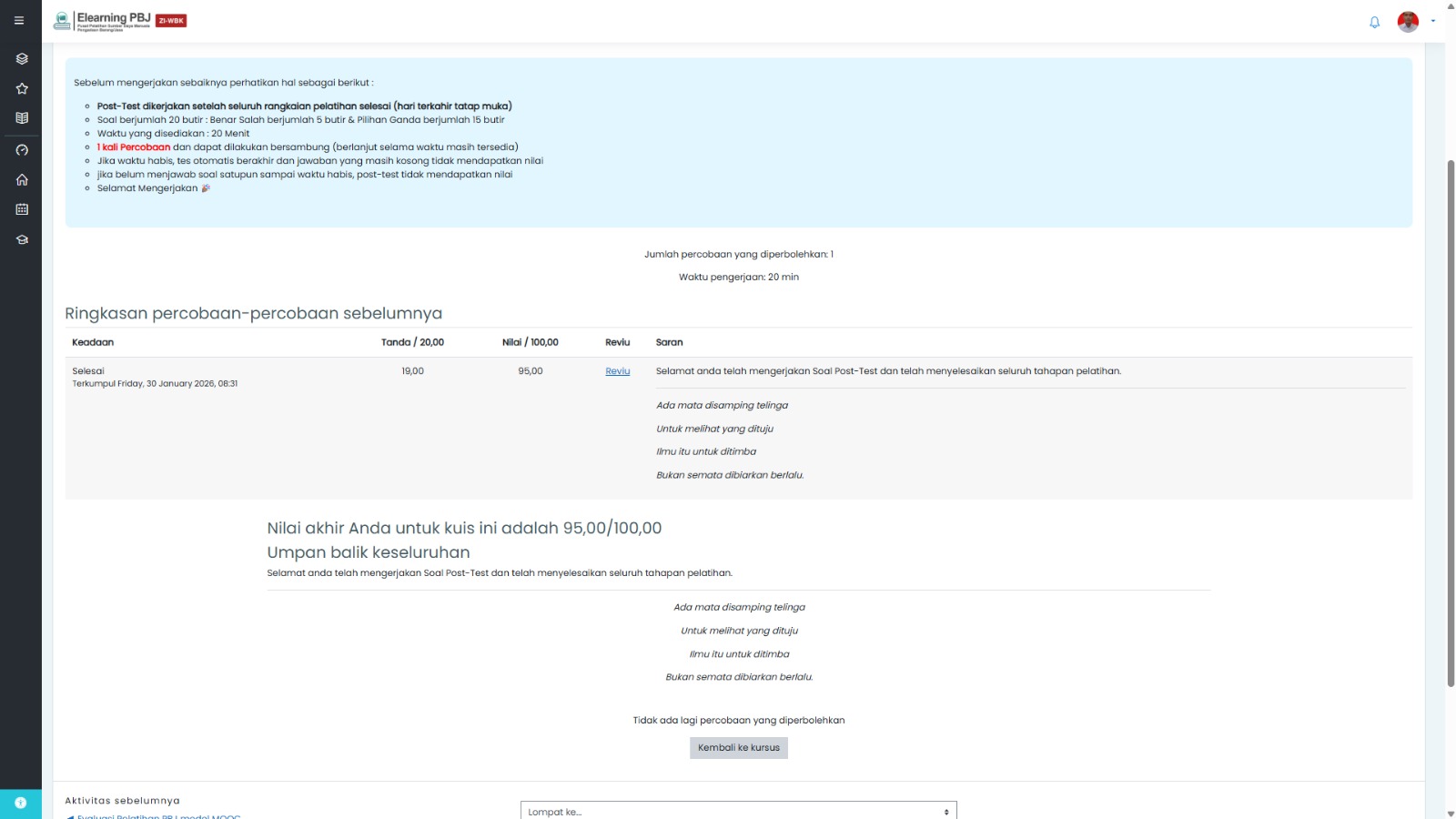 Pelatihan tersebut resmi berakhir pada Jumat, 30 Januari 2026, ditandai dengan selesainya tes post-test terakhir. Berdasarkan hasil evaluasi, Muhammad Ifandi, S.T berhasil memperoleh nilai sangat memuaskan, yang menunjukkan pemahaman dan kompetensi yang baik terhadap materi PBJ yang telah dipelajari.